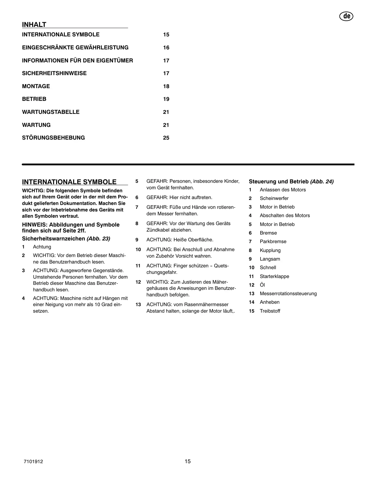 5. Push down on the lift links (2) and tighten the left and right adjuster knobs (1). Make sure the adjuster knobs (1) are tight. If necessary, use a wrench to tighten the adjuster knobs (1). 6. (Figure 13) Raise the lift lever (1). EINGESCHRÄNKTE GEWÄHRLEISTUNG Briggs & Stratton Corporation repariert oder ersetzt kostenlos jedes Teil oder Teile des Produkts, die Material- oder Verarbeitungsschäden oder beides aufweisen. Die Kosten für den Transport des Produkts, das unter dieser Garantie für Reparatur oder Austausch eingeschickt wird, sind vom Käufer zu tragen. Diese Garantie ist für die nachstehend angegebenen Zeiträume gültig und den hier aufgeführten Bedingungen unterworfen. Für Garantiearbeiten finden Sie den nächsten Vertragshändler in Ihrer Gegend auf unserem Händlerverzeichnis unter www.murray.com. ES GIBT KEINE ANDERE AUSDRÜCKLICHE GARANTIELEISTUNG. INBEGRIFFENE GARANTIELEISTUNGEN, EINSCHLIESSLICH SOLCHER FÜR MARKTGÄNGIGE QUALITÄT UND EIGNUNG FÜR EINEN BESTIMMTEN ZWECK, SIND AUF EIN JAHR AB KAUFDATUM BESCHRÄNKT, ODER ALLE INBEGRIFFENEN GARANTIELEISTUNGEN SIND, SOWEIT VON DER GESETZGEBUNG ERLAUBT, Sitzposition des Benutzers auf dem Mäher. de