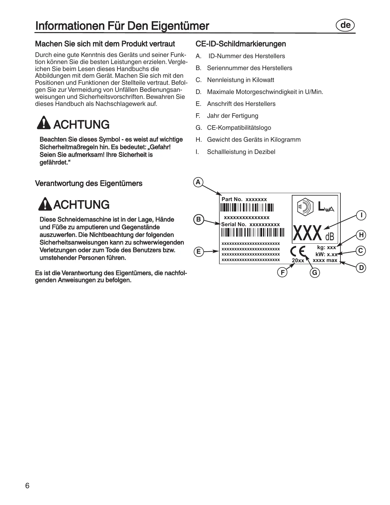 de 8. Wenn Sie große Bereiche mähen, beginnen Sie, indem Sie nach rechts drehen, so dass das abgeschnittene Gras von Büschen, Zäunen, Einfahrten etc. entfernt ausgeworfen wird. Mähen Sie ein oder zwei Runden in der entgegengesetzten Richtung, indem Sie bis zum Ende nur nach links drehen. de Ersetzen Sie beschädigte Teile mit Original-Ersatzteilen, bevor Sie das Gerät in Betrieb nehmen. Gehen Sie zu einem autorisierten Kundendienst-Center in Ihrer Nähe. Lassen Sie das Schneidmesser alle drei Jahre von einem autorisierten Kundendienst-Techniker überprüfen oder ersetzen Sie das alte Schneidmesser durch ein OriginalErsatzteil.