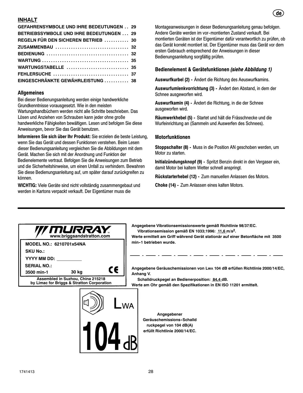 EINGESCHRÄNKTE GEWÄHRLEISTUNG Briggs & Stratton Corporation repariert oder ersetzt kostenlos jedes Teil oder Teile des Produkts, die Material- oder Verarbeitungsschäden oder beides aufweisen. Die Kosten für den Transport des Produkts, das unter dieser Garantie für Reparatur oder Austausch eingeschickt wird, sind vom Käufer zu tragen. Diese Garantie ist für die nachstehend angegebenen Zeiträume gültig und den hier aufgeführten Bedingungen unterworfen. Für Garantiearbeiten finden Sie den nächsten Vertragshändler in Ihrer Gegend auf unserem Händlerverzeichnis unter www.murray.com. ES GIBT KEINE ANDERE AUSDRÜCKLICHE GARANTIELEISTUNG. INBEGRIFFENE GARANTIELEISTUNGEN, EINSCHLIESSLICH SOLCHER FÜR MARKTGÄNGIGE QUALITÄT UND EIGNUNG FÜR EINEN BESTIMMTEN ZWECK, SIND AUF EIN JAHR AB KAUFDATUM BESCHRÄNKT, ODER ALLE INBEGRIFFENEN GARANTIELEISTUNGEN SIND, SOWEIT VON DER GESETZGEBUNG ERLAUBT, AUSGESCHLOSSEN. HAFTUNG FÜR NEBEN- UND FOLGESCHÄDEN IST UNTER ALLEN GARANTIELEISTUNGEN AUSGESCHLOSSEN, SOWEIT EIN DERARTIGER AUSSCHLUSS VOM GESETZ ERLAUBT IST. In manchen Ländern sind Einschränkungen hinsichtlich der Dauer einer konkludenten Garantieleistung nicht zulässig, und in manchen Ländern sind Ausschluss oder Einschränkung von Neben- oder Folgeschäden nicht zulässig, weswegen die oben aufgeführten Einschränkungen und Ausschlüsse u. U. in Ihrem Fall nicht zutreffen. Diese Garantieleistung verleiht Ihnen bestimmte Rechte, neben denen Sie noch andere Rechte haben können, die von Land zu Land abweichen.