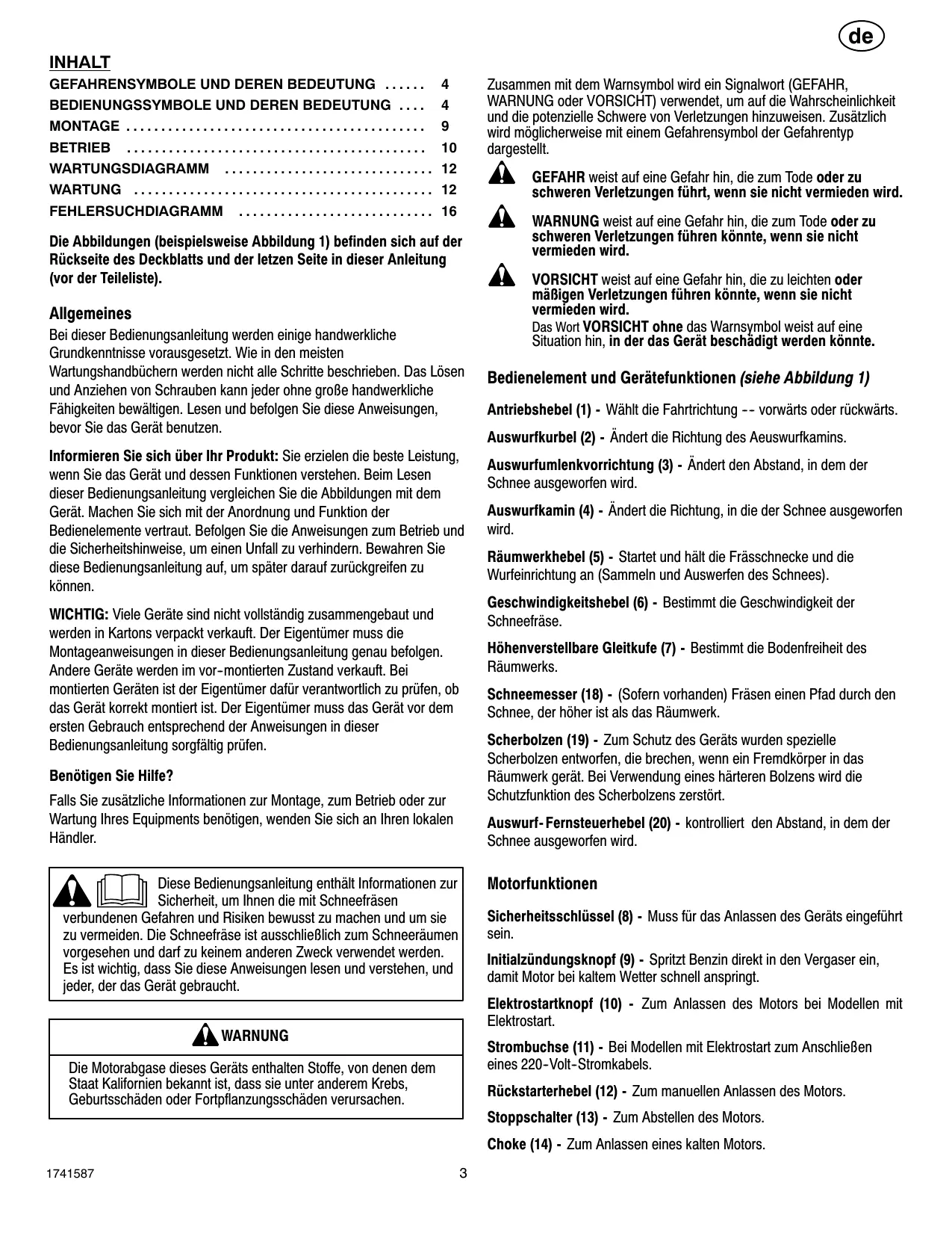 Die Abbildungen (beispielsweise Abbildung 1) befinden sich auf der Rückseite des Deckblatts und der letzen Seite in dieser Anleitung (vor der Teileliste). Allgemeines Bei dieser Bedienungsanleitung werden einige handwerkliche Grundkenntnisse vorausgesetzt. Wie in den meisten Wartungshandbüchern werden nicht alle Schritte beschrieben. Das Lösen und Anziehen von Schrauben kann jeder ohne große handwerkliche Fähigkeiten bewältigen. Lesen und befolgen Sie diese Anweisungen, bevor Sie das Gerät benutzen. Informieren Sie sich über Ihr Produkt: Sie erzielen die beste Leistung, wenn Sie das Gerät und dessen Funktionen verstehen. Beim Lesen dieser Bedienungsanleitung vergleichen Sie die Abbildungen mit dem Gerät. Machen Sie sich mit der Anordnung und Funktion der Bedienelemente vertraut. Befolgen Sie die Anweisungen zum Betrieb und die Sicherheitshinweise, um einen Unfall zu verhindern. Bewahren Sie diese Bedienungsanleitung auf, um später darauf zurückgreifen zu können. WICHTIG: Viele Geräte sind nicht vollständig zusammengebaut und werden in Kartons verpackt verkauft. Der Eigentümer muss die Montageanweisungen in dieser Bedienungsanleitung genau befolgen. Andere Geräte werden im vor--montierten Zustand verkauft. Bei montierten Geräten ist der Eigentümer dafür verantwortlich zu prüfen, ob das Gerät korrekt montiert ist. Der Eigentümer muss das Gerät vor dem ersten Gebrauch entsprechend der Anweisungen in dieser Bedienungsanleitung sorgfältig prüfen. WARNUNG weist auf eine Gefahr hin, die zum Tode oder zu schweren Verletzungen führen könnte, wenn sie nicht vermieden wird. VORSICHT weist auf eine Gefahr hin, die zu leichten oder mäßigen Verletzungen führen könnte, wenn sie nicht vermieden wird. Das Wort VORSICHT ohne das Warnsymbol weist auf eine Situation hin, in der das Gerät beschädigt werden könnte. Bedienelement und Gerätefunktionen (siehe Abbildung 1) Antriebshebel (1) - Wählt die Fahrtrichtung ---- vorwärts oder rückwärts. Auswurfkurbel (2) - Ändert die Richtung des Aeuswurfkamins. Auswurfumlenkvorrichtung (3) - Ändert den Abstand, in dem der Schnee ausgeworfen wird. Auswurfkamin (4) - Ändert die Richtung, in die der Schnee ausgeworfen wird. Räumwerkhebel (5) - Startet und hält die Frässchnecke und die Wurfeinrichtung an (Sammeln und Auswerfen des Schnees). Geschwindigkeitshebel (6) - Bestimmt die Geschwindigkeit der Schneefräse. Höhenverstellbare Gleitkufe (7) - Bestimmt die Bodenfreiheit des Räumwerks. Schneemesser (18) - (Sofern vorhanden) Fräsen einen Pfad durch den Schnee, der höher ist als das Räumwerk. Scherbolzen (19) - Zum Schutz des Geräts wurden spezielle Scherbolzen entworfen, die brechen, wenn ein Fremdkörper in das Räumwerk gerät. Bei Verwendung eines härteren Bolzens wird die Schutzfunktion des Scherbolzens zerstört. Benötigen Sie Hilfe? Falls Sie zusätzliche Informationen zur Montage, zum Betrieb oder zur Wartung Ihres Equipments benötigen, wenden Sie sich an Ihren lokalen Händler. Auswurf- Fernsteuerhebel (20) - kontrolliert den Abstand, in dem der Schnee ausgeworfen wird. Motorfunktionen Diese Bedienungsanleitung enthält Informationen zur Sicherheit, um Ihnen die mit Schneefräsen verbundenen Gefahren und Risiken bewusst zu machen und um sie zu vermeiden. Die Schneefräse ist ausschließlich zum Schneeräumen vorgesehen und darf zu keinem anderen Zweck verwendet werden. Es ist wichtig, dass Sie diese Anweisungen lesen und verstehen, und jeder, der das Gerät gebraucht. Sicherheitsschlüssel (8) - Muss für das Anlassen des Geräts eingeführt sein. Initialzündungsknopf (9) - Spritzt Benzin direkt in den Vergaser ein, damit Motor bei kaltem Wetter schnell anspringt. Elektrostartknopf (10) - Zum Anlassen des Motors bei Modellen mit Elektrostart. WARNUNG Strombuchse (11) - Bei Modellen mit Elektrostart zum Anschließen eines 220--Volt--Stromkabels. Die Motorabgase dieses Geräts enthalten Stoffe, von denen dem Staat Kalifornien bekannt ist, dass sie unter anderem Krebs, Geburtsschäden oder Fortpflanzungsschäden verursachen. Rückstarterhebel (12) - Zum manuellen Anlassen des Motors. Stoppschalter (13) - Zum Abstellen des Motors. Choke (14) - Zum Anlassen eines kalten Motors.