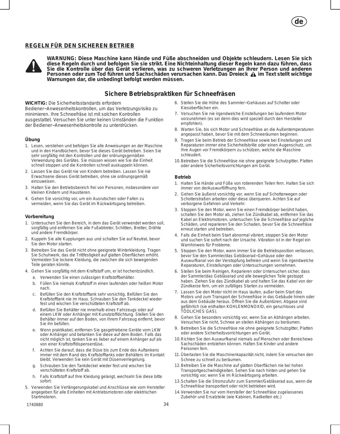 1. Inspectez complètement la zone de traitement et enlevez les paillassons, les luges, les planches, les câbles et tous les autres objets étrangers à l’équipement. 2. Débrayez tous les embrayages et mettez au point mort avant de démarrer la machine (moteur). 3. N’utilisez jamais l’équipement sans porter une tenue d’hiver appropriée. Portez des bottes qui résistent aux surfaces glissantes. Evitez de porter des vêtements larges qui pourraient se prendre dans des pièces mobiles. 4. Manipulez l’essence avec précaution, elle est hautement inflammable. a. Utilisez un récipient à essence homologué. b. N’ajoutez jamais d’essence dans un moteur chaud ou en marche. c. Remplissez le réservoir d’essence avec une extrême précaution à l’extérieur. Ne remplissez jamais le réservoir d’essence à l’intérieur. Revissez le bouchon du réservoir à fond et essuyez l’essence répandue. d. Ne remplissez jamais des récipients à l’intérieur d’un véhicule, d’un camion ou d’une remorque avec une bâche en plastique. Placez toujours les récipients sur le sol, loin des véhicules, avant de les remplir. e. Si cela est plus pratique, enlevez les appareils fonctionnant à l’essence du camion ou de la remorque et remplissez−les à même le sol. Si ce n’est pas possible, alors remplissez avec un récipient portable plutôt qu’à partir du gicleur du distributeur de carburant. f. Maintenez le gicleur en contact avec le bord du réservoir de carburant ou l’ouverture du récipient jusqu’à ce que le remplissage soit complet. N’utilisez pas un outil de fermeture/ouverture de gicleur. g. Revissez le bouchon du réservoir à fond et essuyez l’essence répandue. h. Si de l’essence s’est répandue sur les vêtements, changez−les immédiatement. 5. Utilisez des rallonges et des récipients tel qu’indiqué par le fabricant pour toutes les machines ayant des moteurs à fonctionnement ou à propulsion électrique. 1740880