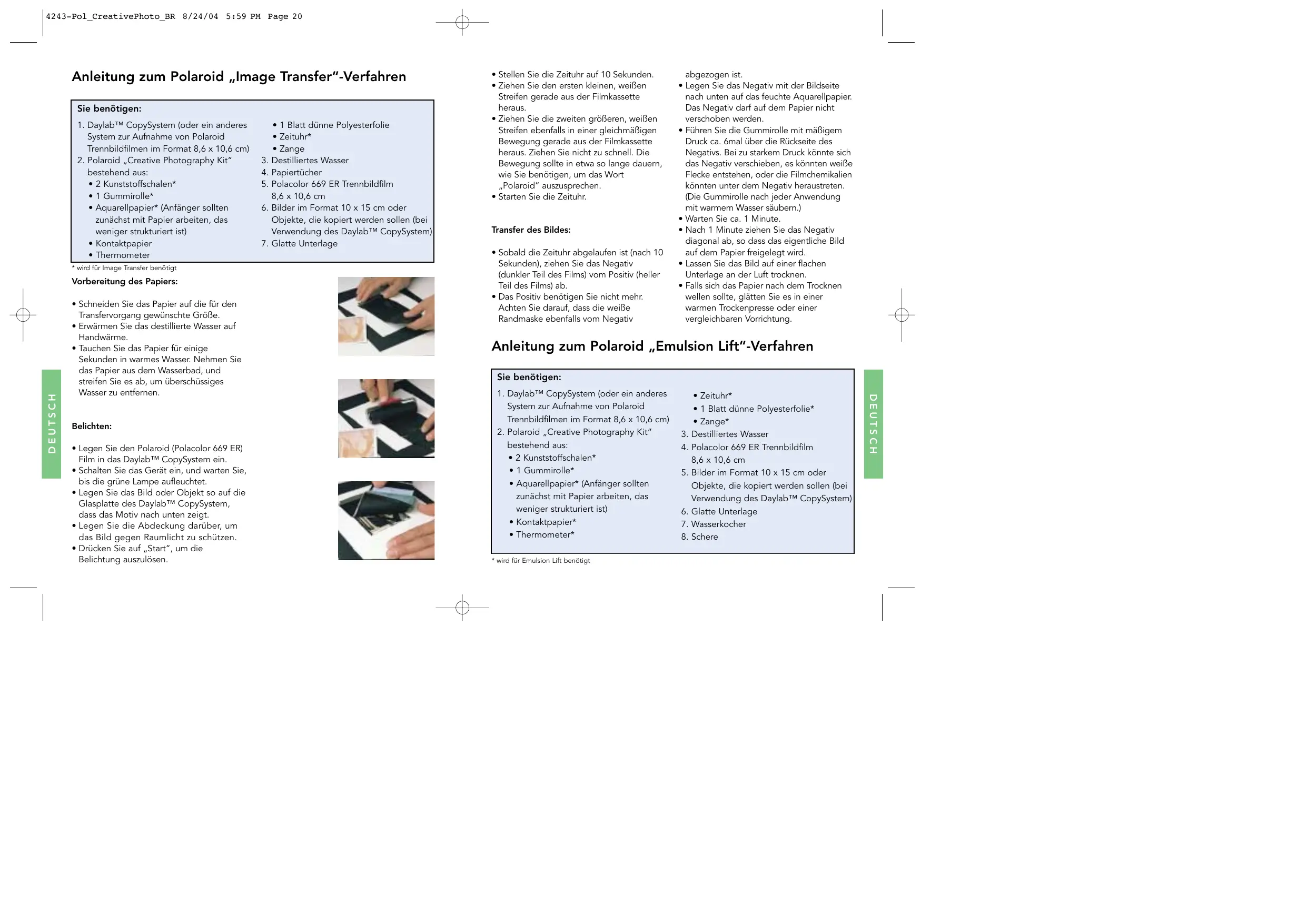 - Zange* Destilliertes Wasser Polacolor 669 ER Trennbildfilm 8,6 x 10,6 cm Bilder im Format 10 x 15 cm oder Objekte, die kopiert werden sollen (bei Verwendung des Daylab™ CopySystem) Glatte Unterlage Wasserkocher Schere DEUTSCH DEUTSCH Vorbereitung des Papiers: