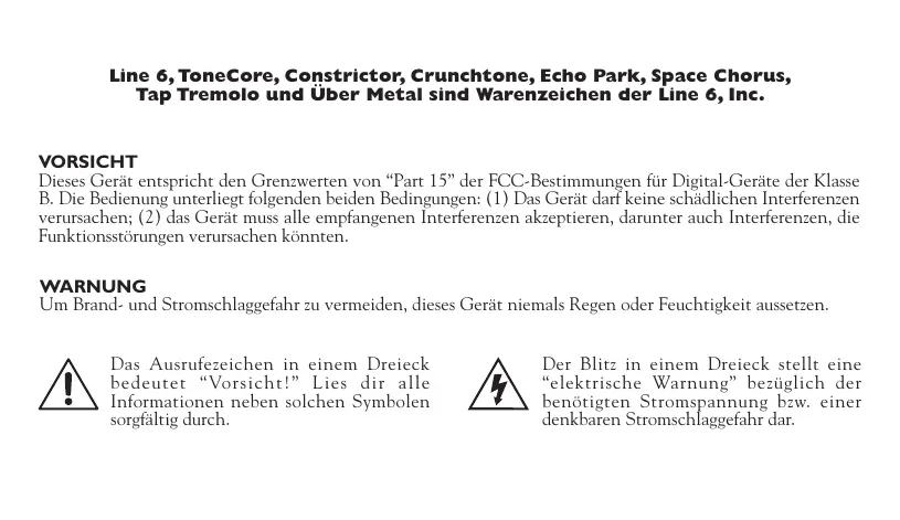 THE FOREGOING WARRANTY IS THE ONLY WARRANTY GIVEN BY LINE 6 AND IS IN LIEU OF ALL OTHER WARRANTIES. ALL IMPLIED WARRANTIES, INCLUDING WARRANTIES OF MERCHANTABILITY AND FITNESS FOR ANY PARTICULAR PURPOSE, EXCEEDING THE SPECIFIC PROVISIONS OF THIS WARRANTY ARE HEREBY DISCLAIMED AND EXCLUDED FROM THIS WARRANTY. UPON EXPIRATION OF THE APPLICABLE EXPRESS WARRANTY PERIOD (1 YEAR), LINE 6 SHALL HAVE NO FURTHER WARRANTY OBLIGATION OF ANY KIND, EXPRESS OR IMPLIED. LINE 6 SHALL IN NO EVENT BE LIABLE FOR ANY SPECIAL, INCIDENTAL OR CONSEQUENTIAL DAMAGES SUFFERED BY THE PURCHASER OR ANY THIRD PARTY, INCLUDING WITHOUT LIMITATION, DAMAGES FOR LOSS OF PROFITS OR BUSINESS, OR DAMAGES RESULTING FROM USE OR PERFORMANCE OF THE PRODUCT, WHETHER IN CONTRACT OR IN TORT. LINE 6 SHALL NOT BE LIABLE FOR ANY EXPENSES, CLAIMS, OR SUITS ARISING OUT OF OR RELATING TO ANY OF THE FOREGOING. Some states do not allow the exclusion or limitation of implied warranties so some of the above limitations and exclusions may not apply to you. This warranty gives you specific legal rights, and you may also have other rights, which vary, from state to state. This warranty only applies to products sold and used in the USA and Canada. Line 6 shall not be liable for damages or loss resulting from the negligent or intentional acts of the shipper or its contracted affiliates. You should contact the shipper for proper claims procedures in the event of damage or loss resulting from shipment. Customer Service Before contacting the Line 6 Customer Service team, please take the time to look through this publication to see if it can answer your questions. Additional helpful information is on the Support page of the Line 6 web site at www.line6.com/support , including the searchable Knowlegebase/FAQTRAQ system which is often the fastest and easiest way to get the answers you need. Need to talk to an actual human on the Line 6 Customer Service team by phone? Have your serial number handy and take some notes for yourself before you call, so you remember everything you want to ask about. In the USA or Canada, you can contact Line 6 at (818) 575-3600, 8AM to 5PM Monday through Friday (Pacific Time). Outside the USA and Canada, please contact your distributor directly to arrange service. The list of Line 6 distributors is available on the Internet at www.line6.com. To obtain factory service You must obtain a return authorization (RA) number before sending any unit to Line 6 for service. Products returned without an RA number will be returned to your at your sole expense. If you live in the United States, log an incident in our online support system at www.line6.com/support or call (818) 575-3600 or and we will help you find the best way to get your unit repaired, whether it be returning the unit to Line 6 or finding an Authorized Service Center. If you live in Europe, email euroinfo@line6.com or call Line 6 UK at +44 (0)178 882 1600. If you live outside of these areas, please contact your local distributor. If you do not know whom your distributor is, either call us at (818) 575-3600 or use the distributor locator at www.line6.com/support . Line 6, ToneCore, Constrictor, Crunchtone, Echo Park, Space Chorus, Tap Tremolo und Über Metal sind Warenzeichen der Line 6, Inc. VORSICHT Dieses Gerät entspricht den Grenzwerten von “Part 15” der FCC-Bestimmungen für Digital-Geräte der Klasse B. Die Bedienung unterliegt folgenden beiden Bedingungen: (1) Das Gerät darf keine schädlichen Interferenzen verursachen; (2) das Gerät muss alle empfangenen Interferenzen akzeptieren, darunter auch Interferenzen, die Funktionsstörungen verursachen könnten. WARNUNG Um Brand- und Stromschlaggefahr zu vermeiden, dieses Gerät niemals Regen oder Feuchtigkeit aussetzen. Das Ausrufezeichen in einem Dreieck bedeutet “Vorsicht!” Lies dir alle Informationen neben solchen Symbolen sorgfältig durch. Der Blitz in einem Dreieck stellt eine “elektrische Warnung” bezüglich der benötigten Stromspannung bzw. einer denkbaren Stromschlaggefahr dar. Bitte die folgenden wichtigen Sicherheitshinweise durchlesen. Bewahre diese Anleitung an einem sicheren Ort auf. Vor dem Einsatz des ToneCore musst du dir alle zutreffenden Punkte und Sicherheitshinweise durchlesen.
