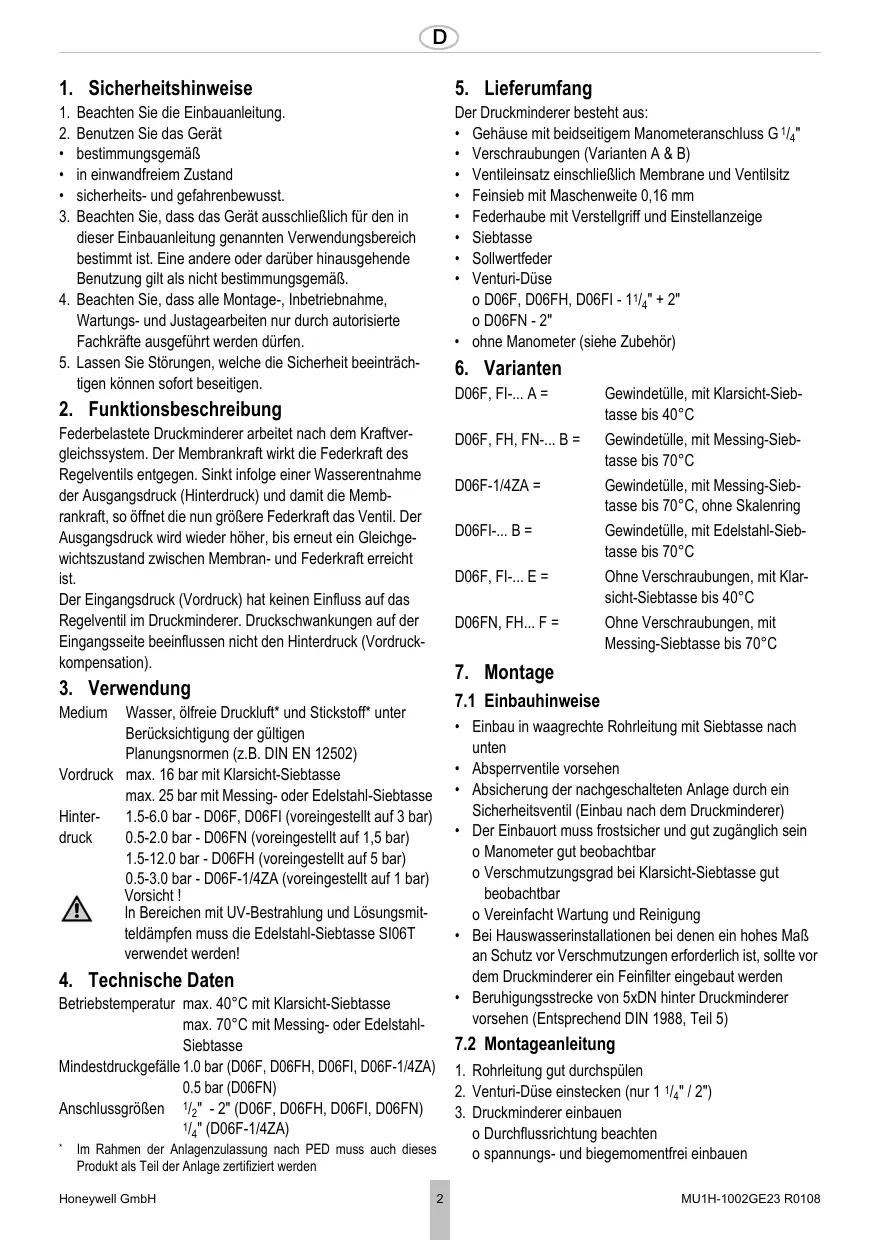 Der Druckminderer besteht aus: • Gehäuse mit beidseitigem Manometeranschluss G 1/4" • Verschraubungen (Varianten A & B) • Ventileinsatz einschließlich Membrane und Ventilsitz • Feinsieb mit Maschenweite 0,16 mm • Federhaube mit Verstellgriff und Einstellanzeige • Siebtasse • Sollwertfeder • Venturi-Düse o D06F, D06FH, D06FI - 11/4" + 2" o D06FN - 2" • ohne Manometer (siehe Zubehör)