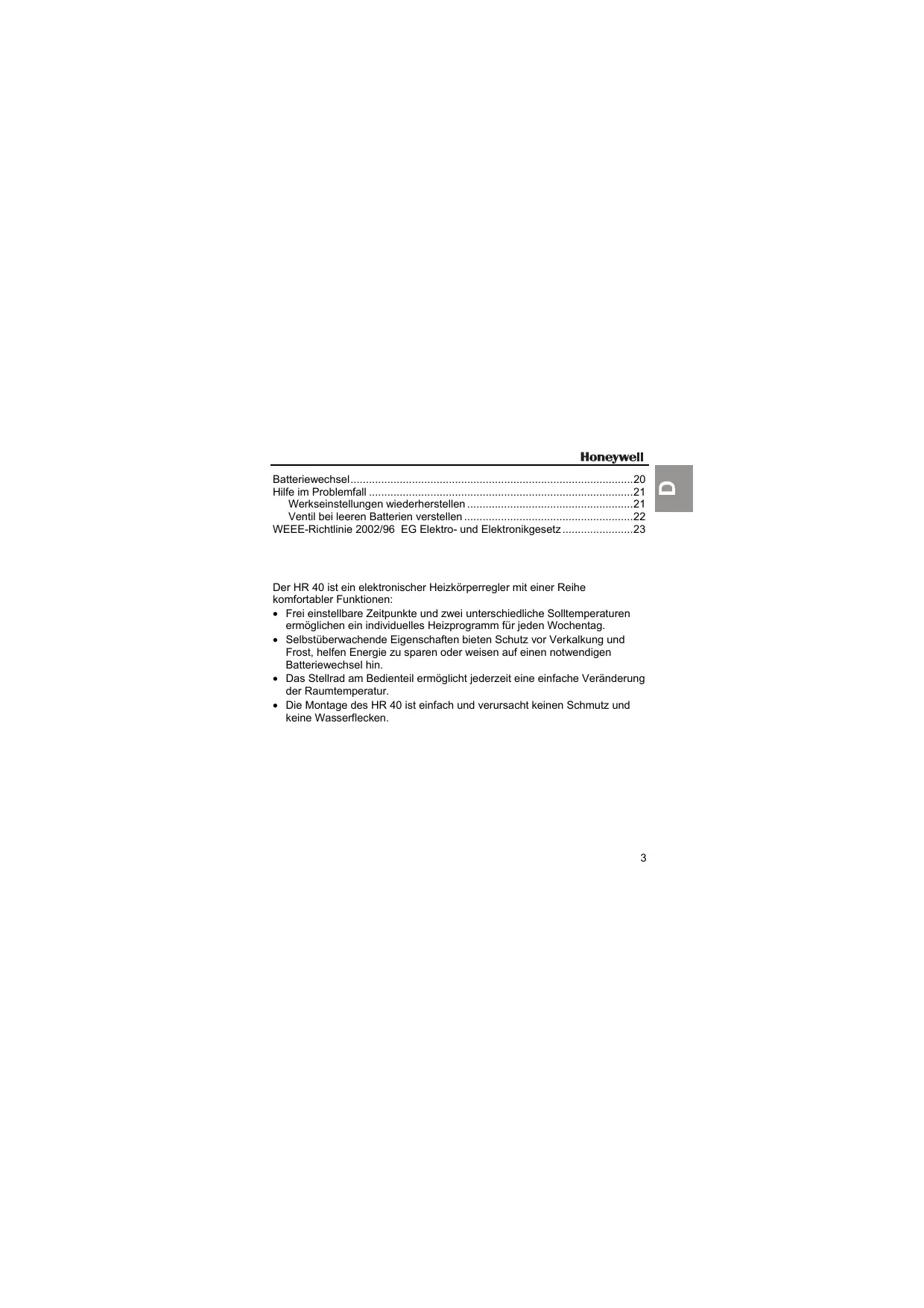 BEDIENUNGSANLEITUNG HR40 HONEYWELL