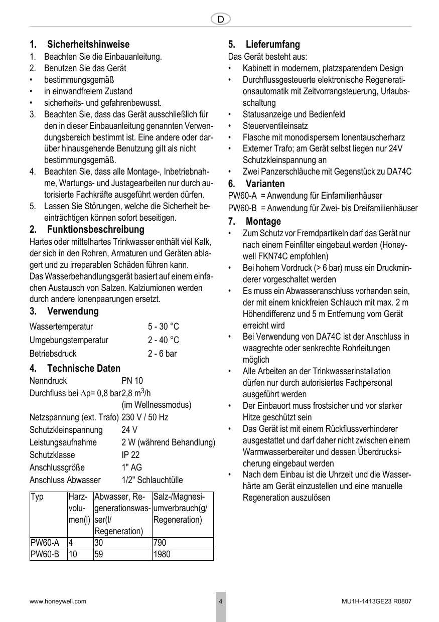 Montage Zum Schutz vor Fremdpartikeln darf das Gerät nur nach einem Feinfilter eingebaut werden (Honeywell FKN74C empfohlen) Bei hohem Vordruck (> 6 bar) muss ein Druckminderer vorgeschaltet werden Es muss ein Abwasseranschluss vorhanden sein, der mit einem knickfreien Schlauch mit max. 2 m Höhendifferenz und 5 m Entfernung vom Gerät erreicht wird Bei Verwendung von DA74C ist der Anschluss in waagrechte oder senkrechte Rohrleitungen möglich Alle Arbeiten an der Trinkwasserinstallation dürfen nur durch autorisiertes Fachpersonal ausgeführt werden Der Einbauort muss frostsicher und vor starker Hitze geschützt sein Das Gerät ist mit einem Rückflussverhinderer ausgestattet und darf daher nicht zwischen einem Warmwasserbereiter und dessen Überdrucksicherung eingebaut werden Nach dem Einbau ist die Uhrzeit und die Wasserhärte am Gerät einzustellen und eine manuelle Regeneration auszulösen