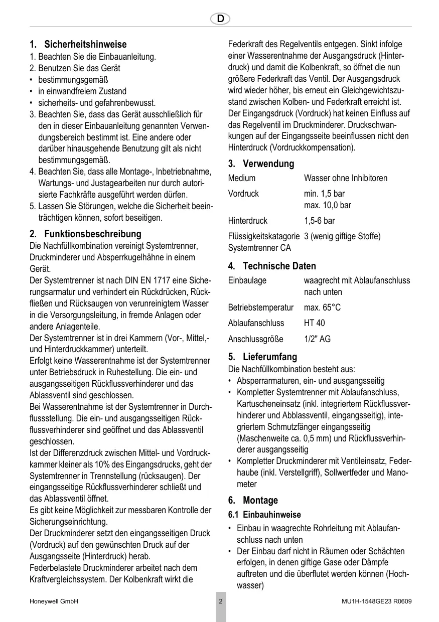 5. Lieferumfang Die Nachfüllkombination besteht aus: • Absperrarmaturen, ein- und ausgangsseitig • Kompletter Systemtrenner mit Ablaufanschluss, Kartuscheneinsatz (inkl. integriertem Rückflussverhinderer und Abblassventil, eingangsseitig), integriertem Schmutzfänger eingangsseitig (Maschenweite ca. 0,5 mm) und Rückflussverhinderer ausgangsseitig • Kompletter Druckminderer mit Ventileinsatz, Federhaube (inkl. Verstellgriff), Sollwertfeder und Manometer