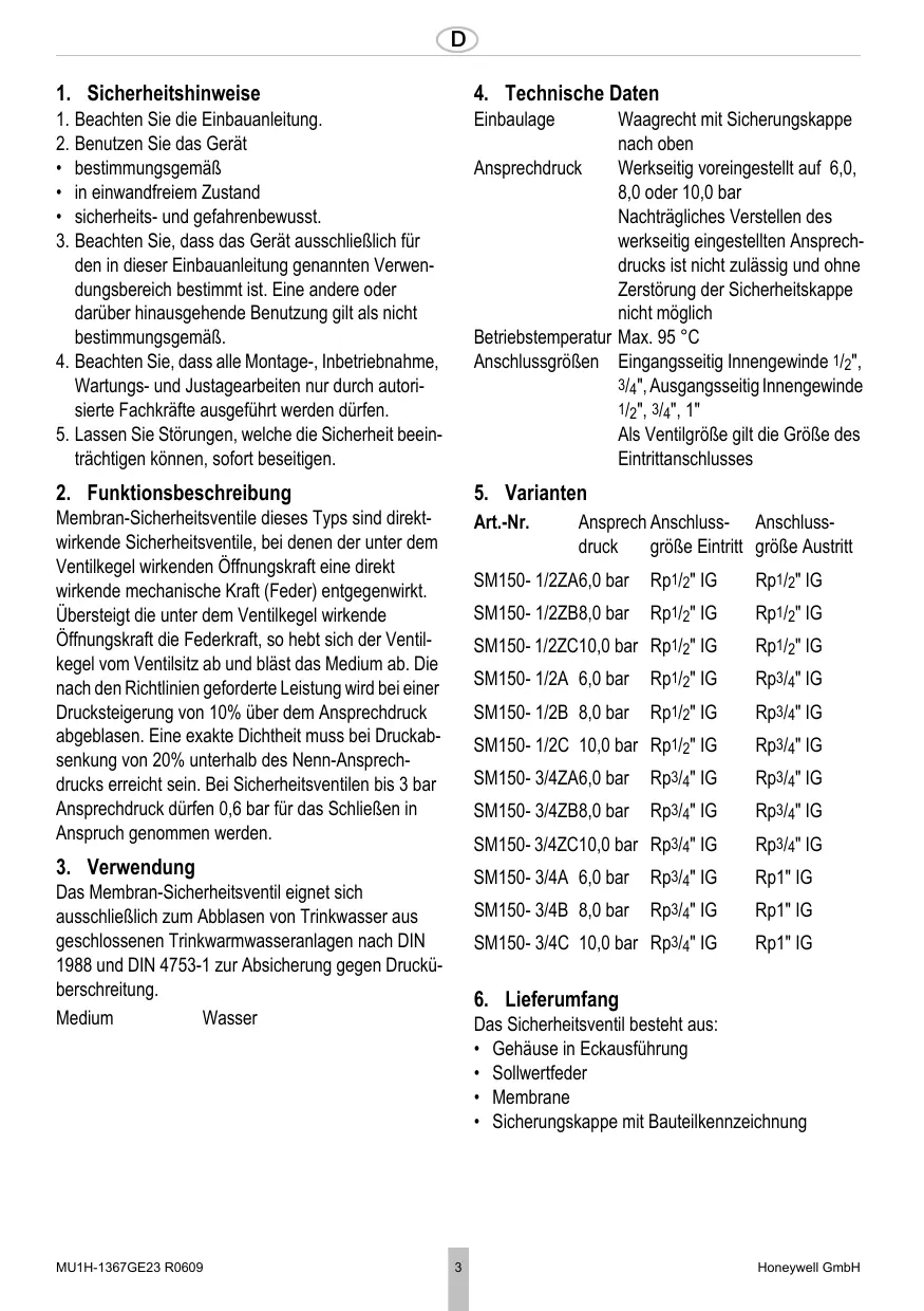 3. Verwendung Das Membran-Sicherheitsventil eignet sich ausschließlich zum Abblasen von Trinkwasser aus geschlossenen Trinkwarmwasseranlagen nach DIN 1988 und DIN 4753-1 zur Absicherung gegen Drucküberschreitung. Medium Wasser