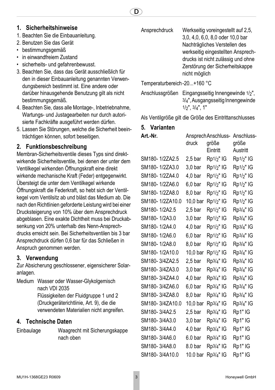Ansprech Anschlussdruck größe Eintritt SM180- 1/2ZA2.5 2,5 bar Rp1/2" IG SM180- 1/2ZA3.0 3,0 bar Rp1/2" IG SM180- 1/2ZA4.0 4,0 bar Rp1/2" IG SM180- 1/2ZA6.0 6,0 bar Rp1/2" IG SM180- 1/2ZA8.0 8,0 bar Rp1/2" IG SM180- 1/2ZA10.0 10,0 bar Rp1/2" IG SM180- 1/2A2.5 2,5 bar Rp1/2" IG SM180- 1/2A3.0 3,0 bar Rp1/2" IG SM180- 1/2A4.0 4,0 bar Rp1/2" IG SM180- 1/2A6.0 6,0 bar Rp1/2" IG SM180- 1/2A8.0 8,0 bar Rp1/2" IG SM180- 1/2A10.0 10,0 bar Rp1/2" IG SM180- 3/4ZA2.5 2,5 bar Rp3/4" IG SM180- 3/4ZA3.0 3,0 bar Rp3/4" IG SM180- 3/4ZA4.0 4,0 bar Rp3/4" IG SM180- 3/4ZA6.0 6,0 bar Rp3/4" IG SM180- 3/4ZA8.0 8,0 bar Rp3/4" IG SM180- 3/4ZA10.0 10,0 bar Rp3/4" IG SM180- 3/4A2.5 2,5 bar Rp3/4" IG SM180- 3/4A3.0 3,0 bar Rp3/4" IG SM180- 3/4A4.0 4,0 bar Rp3/4" IG SM180- 3/4A6.0 6.0 bar Rp3/4" IG SM180- 3/4A8.0 8.0 bar Rp3/4" IG SM180- 3/4A10.0 10.0 bar Rp3/4" IG