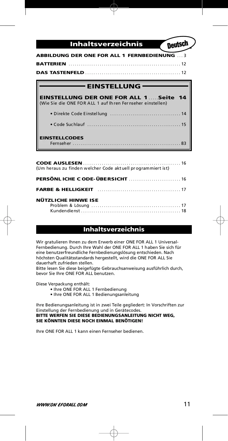 EINSTELLUNG EINSTELLUNG DER ONE FOR ALL 1 . . . . .Seite 14 (Wie S ie die ONE FO R A LL 1 auf Ih ren Fer nseher einstellen) • Direkte Code E instel lung . . . . . . . . . . . . . . . . . . . . . . . . . . . . . . . . . . 14 • C ode Suc hlauf . . . . . . . . . . . . . . . . . . . . . . . . . . . . . . . . . . . . . . . . . . . . . 15 EINSTELLCODES Fernseher . . . . . . . . . . . . . . . . . . . . . . . . . . . . . . . . . . . . . . . . . . . . . . . . . . . . 83