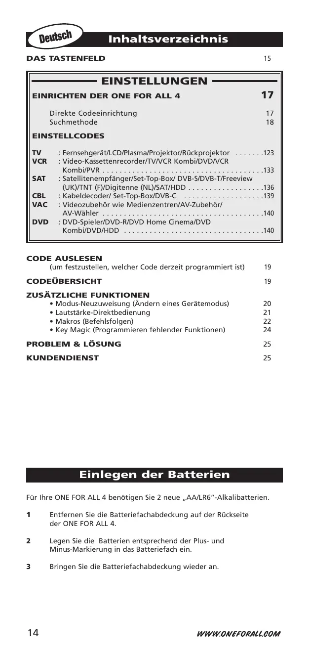 WWW.ONEFORALL.COM Einrichten der ONE FOR ALL 4 Lesen Sie diese Hinweise sorgfältig durch, bevor Sie beginnen