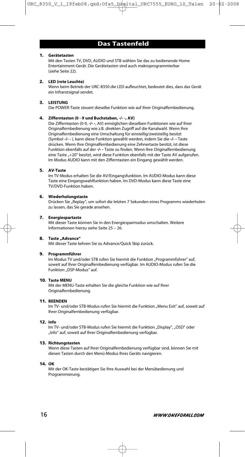 URC 8350 - Universelle Fernbedienung ONEFORALL - Kostenlose Bedienungsanleitung