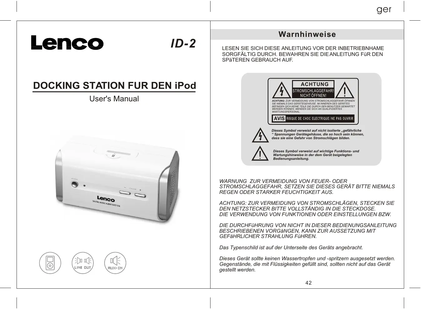 ger Warnhinweise ID-2 DOCKING STATION FUR DEN iPod User's Manual LESEN SIE SICH DIESE ANLEITUNG VOR DER INBETRIEBNHAME SORGFÄLTIG DURCH. BEWAHREN SIE DIE ANLEITUNG FüR DEN SPäTEREN GEBRAUCH AUF. ACHTUNG STROMSCHLAGGEFAHR! NICHT ÖFFNEN!