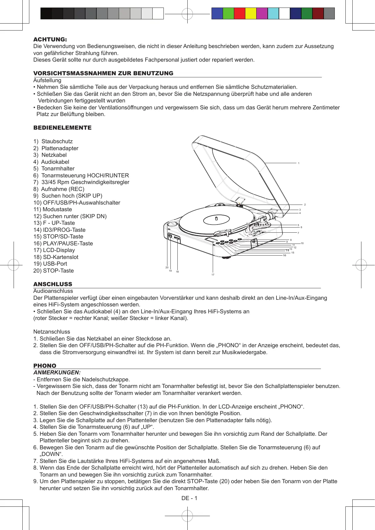 2. Fije el selector de velocidades 33/45 rpm (7) en la posición correcta según el disco que se reproducirá. 3. Coloque el disco sobre el plato (use el adaptador de eje de ser necesario). 4. Deslice el selector UP/DOWN (6) a la posición “UP”. 5. Levante el brazo de la aguja del apoyo y muévalo lentamente a un lado del disco. El disco comenzará a girar. 6. Coloque el brazo de la aguja en la posición deseada del disco y deslice el selector UP/DOWN (6) a la posición “DOWN”. 7. Ajuste el volumen hasta el nivel deseado en su sistema Hi-Fi. 8. Al final del disco, el plato dejará de girar automáticamente. Levante el brazo del disco y devuélvalo al apoyo. 9. Para detenerlo manualmente, pulse el botón STOP (20) directamente, o levante el brazo de la aguja del disco y devuélvalo al apoyo. 4. Para cancelar la reproducción repetida, pulse el botón “STOP” (20) ó pulse el botón “MODE” (11) repetidamente hasta que el indicador de repetición desaparezca REPRODUCCIÓN INTRO Presenta todas las canciones reproduciendo los primeros 10 segundos de cada pista. 1. Ya sea en el modo de detención o de reproducción, pulse el botón “MODE” (11) cuatro veces y el indicador “INTRO” se iluminará. 2. Para cancelar la reproducción intro, pulse el botón “STOP” (20) ó pulse el botón “MODE” (11) repetidamente hasta que el indicador de intro desaparezca. • Ne branchez pas l’appareil à la prise secteur avant d’avoir vérifier la tension du courant secteur local et avant d’effectuer tout autre branchement. • Ne recouvrez aucune bouche d’aération et assurez-vous qu’il y ait un espace de plusieurs centimètres autour de l’appareil pour la ventilation. LOCALISATION DES COMMANDES