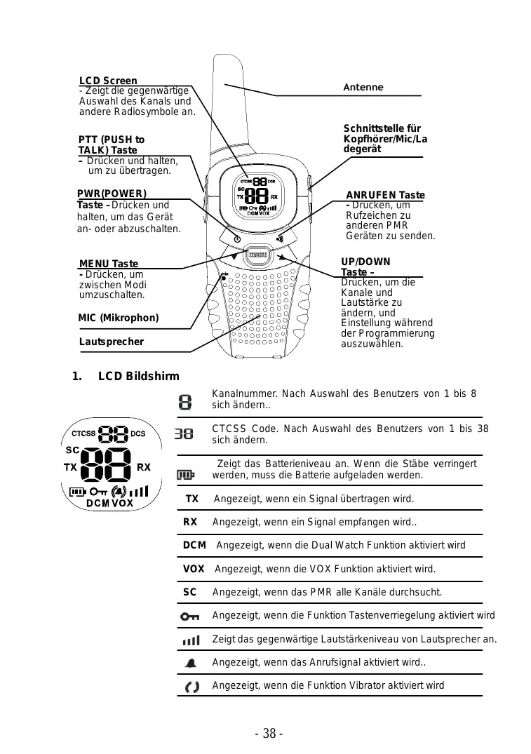 LCD Bildshirm Kanalnummer. Nach Auswahl des Benutzers von 1 bis 8 sich ändern.. CTCSS Code. Nach Auswahl des Benutzers von 1 bis 38 sich ändern. Zeigt das Batterieniveau an. Wenn die Stäbe verringert werden, muss die Batterie aufgeladen werden.