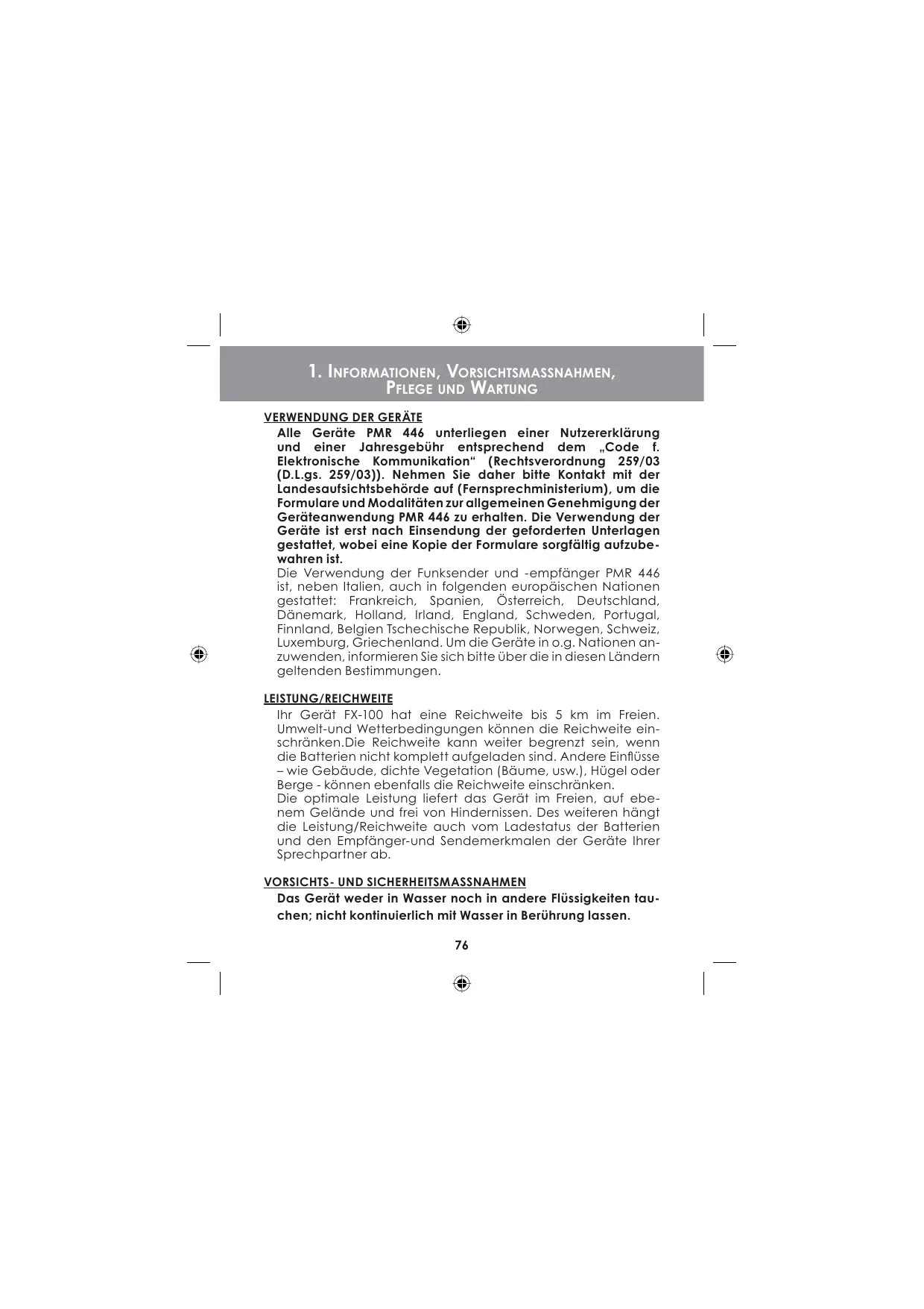 Alle Geräte PMR 446 unterliegen einer Nutzererklärung und einer Jahresgebühr entsprechend dem „Code f. Elektronische Kommunikation“ (Rechtsverordnung 259/03 (D.L.gs. 259/03)). Nehmen Sie daher bitte Kontakt mit der Landesaufsichtsbehörde auf (Fernsprechministerium), um die Formulare und Modalitäten zur allgemeinen Genehmigung der Geräteanwendung PMR 446 zu erhalten. Die Verwendung der Geräte ist erst nach Einsendung der geforderten Unterlagen gestattet, wobei eine Kopie der Formulare sorgfältig aufzubewahren ist. Die Verwendung der Funksender und -empfänger PMR 446 ist, neben Italien, auch in folgenden europäischen Nationen gestattet: Frankreich, Spanien, Österreich, Deutschland, Dänemark, Holland, Irland, England, Schweden, Portugal, Finnland, Belgien Tschechische Republik, Norwegen, Schweiz, Luxemburg, Griechenland. Um die Geräte in o.g. Nationen anzuwenden, informieren Sie sich bitte über die in diesen Ländern geltenden Bestimmungen. LEISTUNG/REICHWEITE Ihr Gerät FX-100 hat eine Reichweite bis 5 km im Freien. Umwelt-und Wetterbedingungen können die Reichweite einschränken.Die Reichweite kann weiter begrenzt sein, wenn die Batterien nicht komplett aufgeladen sind. Andere Einfl üsse – wie Gebäude, dichte Vegetation (Bäume, usw.), Hügel oder Berge - können ebenfalls die Reichweite einschränken. Die optimale Leistung liefert das Gerät im Freien, auf ebenem Gelände und frei von Hindernissen. Des weiteren hängt die Leistung/Reichweite auch vom Ladestatus der Batterien und den Empfänger-und Sendemerkmalen der Geräte Ihrer Sprechpartner ab.