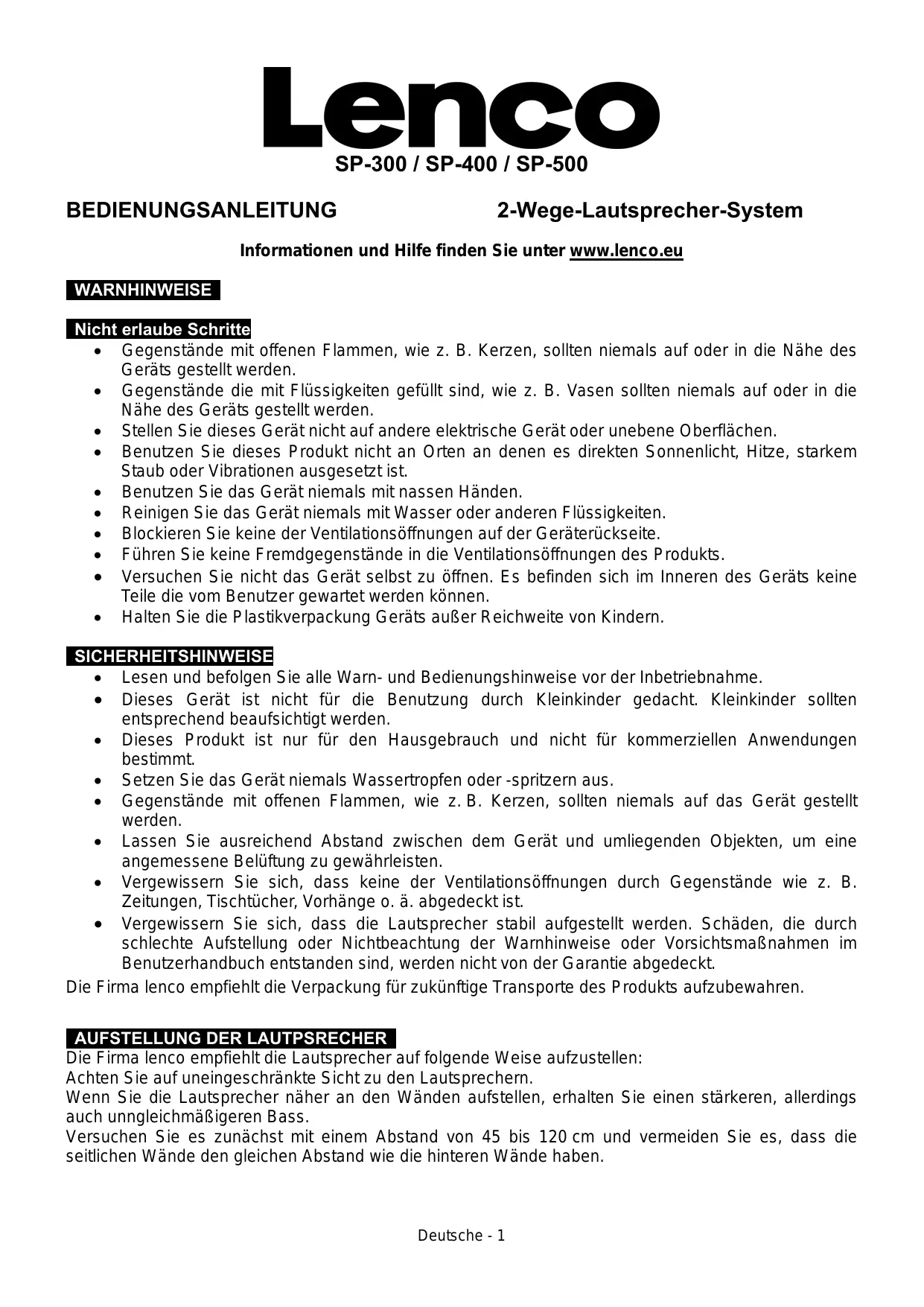 80Hz~22KHz Sensitivity (1W/m) 87 dB 87 dB 70Hz~22KHz 88 dB Impedance 4 ohm 8 ohm 8 ohm 10 ~ 100W 20 ~ 120W 25 ~ 130W Amplifier requirement: <<< Design and specifications are subject to change without notice >>> If at any time in the future you should need to dispose of this product please note that: Waste electrical products should not be disposed of with household waste. Please recycle where facilities exist. Check with your Local Authority or retailer for recycling advice. (Waste Electrical and Electronic Equipment Directive) English - 2 SP-300 / SP-400 / SP-500 BEDIENUNGSANLEITUNG 2-Wege-Lautsprecher-System Informationen und Hilfe finden Sie unter www.lenco.eu WARNHINWEISE Nicht erlaube Schritte