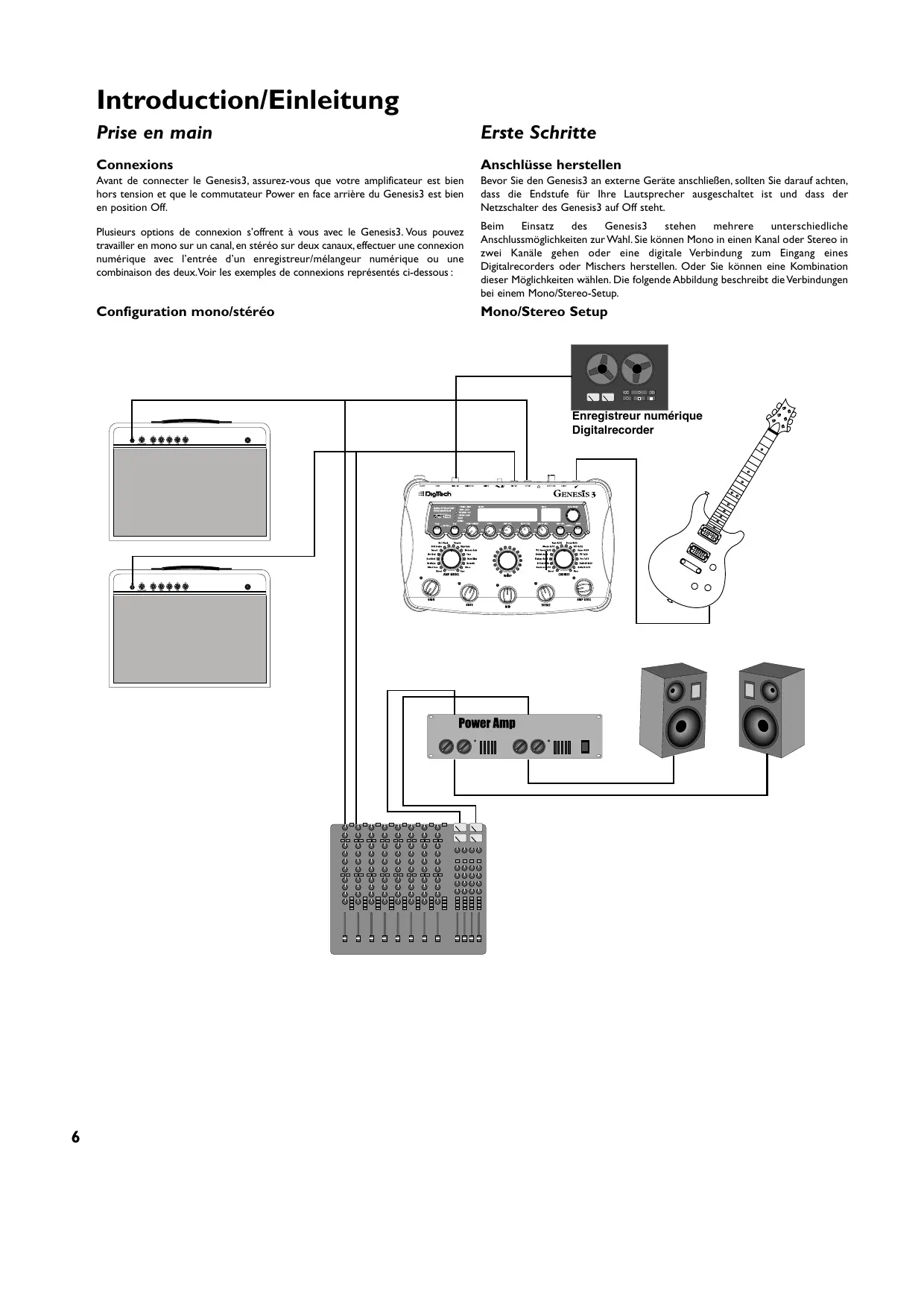 Introduction/Einleitung Prise en main Erste Schritte Connexions Anschlüsse herstellen Avant de connecter le Genesis3, assurez-vous que votre amplificateur est bien hors tension et que le commutateur Power en face arrière du Genesis3 est bien en position Off. Bevor Sie den Genesis3 an externe Geräte anschließen, sollten Sie darauf achten, dass die Endstufe für Ihre Lautsprecher ausgeschaltet ist und dass der Netzschalter des Genesis3 auf Off steht. Plusieurs options de connexion s’offrent à vous avec le Genesis3. Vous pouvez travailler en mono sur un canal, en stéréo sur deux canaux, effectuer une connexion numérique avec l’entrée d’un enregistreur/mélangeur numérique ou une combinaison des deux.Voir les exemples de connexions représentés ci-dessous : Configuration mono/stéréo Beim Einsatz des Genesis3 stehen mehrere unterschiedliche Anschlussmöglichkeiten zur Wahl. Sie können Mono in einen Kanal oder Stereo in zwei Kanäle gehen oder eine digitale Verbindung zum Eingang eines Digitalrecorders oder Mischers herstellen. Oder Sie können eine Kombination dieser Möglichkeiten wählen. Die folgende Abbildung beschreibt die Verbindungen bei einem Mono/Stereo-Setup. Mono/Stereo Setup Enregistreur numérique Digitalrecorder