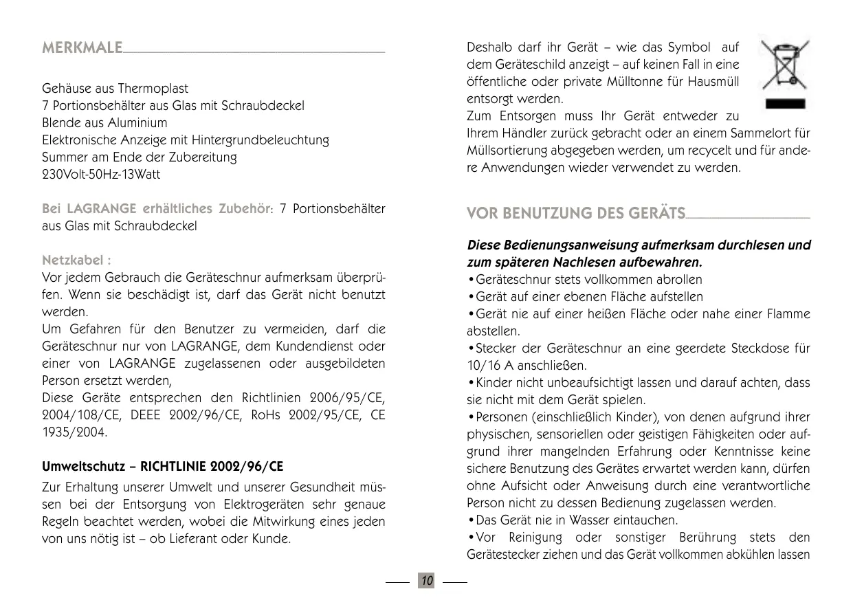 - Ein gestörtes Gerät nicht benutzen, sondern den Kundendienst von LAGRANGE verständigen.