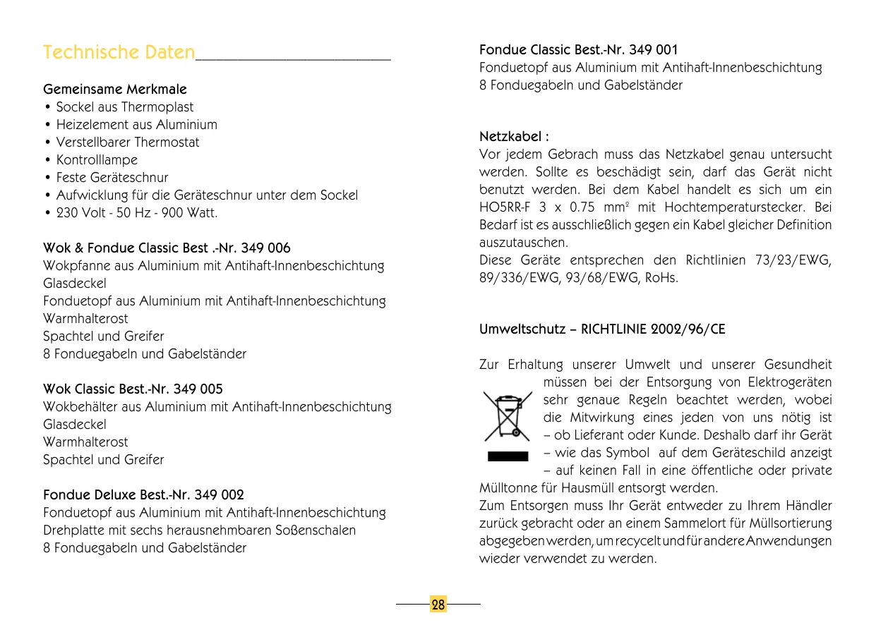 - 230 Volt - 50 Hz - 900 Watt. Netzkabel : Vor jedem Gebrach muss das Netzkabel genau untersucht werden. Sollte es beschädigt sein, darf das Gerät nicht benutzt werden. Bei dem Kabel handelt es sich um ein HO5RR-F 3 x 0.75 mm2 mit Hochtemperaturstecker. Bei Bedarf ist es ausschließlich gegen ein Kabel gleicher Definition auszutauschen. Diese Geräte entsprechen den Richtlinien 73/23/EWG, 89/336/EWG, 93/68/EWG, RoHs. Wok & Fondue Classic Best .-Nr. 349 006 Wokpfanne aus Aluminium mit Antihaft-Innenbeschichtung Glasdeckel Fonduetopf aus Aluminium mit Antihaft-Innenbeschichtung Warmhalterost Spachtel und Greifer 8 Fonduegabeln und Gabelständer Umweltschutz – RICHTLINIE 2002/96/CE Zur Erhaltung unserer Umwelt und unserer Gesundheit müssen bei der Entsorgung von Elektrogeräten sehr genaue Regeln beachtet werden, wobei die Mitwirkung eines jeden von uns nötig ist – ob Lieferant oder Kunde. Deshalb darf ihr Gerät – wie das Symbol auf dem Geräteschild anzeigt – auf keinen Fall in eine öffentliche oder private Mülltonne für Hausmüll entsorgt werden. Zum Entsorgen muss Ihr Gerät entweder zu Ihrem Händler zurück gebracht oder an einem Sammelort für Müllsortierung abgegeben werden, um recycelt und für andere Anwendungen wieder verwendet zu werden. Wok Classic Best.-Nr. 349 005 Wokbehälter aus Aluminium mit Antihaft-Innenbeschichtung Glasdeckel Warmhalterost Spachtel und Greifer Fondue Deluxe Best.-Nr. 349 002 Fonduetopf aus Aluminium mit Antihaft-Innenbeschichtung Drehplatte mit sechs herausnehmbaren Soßenschalen 8 Fonduegabeln und Gabelständer