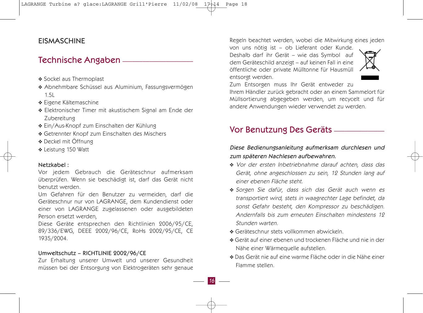 These Geräte entsprechen den Richtlinien 2006/95/CE, 89/336/EWG, DEEE 2002/96/CE, RoHs 2002/95/CE, CE 1935/2004.