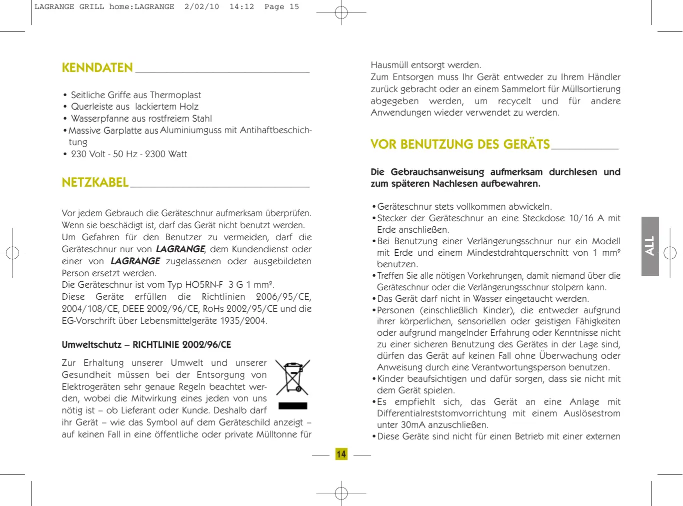 - Diese Geräte sind nicht für einen Betrieb mit einer externen Vor jedem Gebrauch die Geräteschnur aufmerksam überprüfen. Wenn sie beschädigt ist, darf das Gerät nicht benutzt werden. Um Gefahren für den Benutzer zu vermeiden, darf die Geräteschnur nur von LAGRANGE, dem Kundendienst oder einer von LAGRANGE zugelassenen oder ausgebildeten Person ersetzt werden. Die Geräteschnur ist vom Typ HO5RN-F 3 G 1 mm². Diese Geräte erfüllen die Richtlinien 2006/95/CE, 2004/108/CE, DEEE 2002/96/CE, RoHs 2002/95/CE und die EG-Vorschrift über Lebensmittelgeräte 1935/2004. Umweltschutz – RICHTLINIE 2002/96/CE Zur Erhaltung unserer Umwelt und unserer Gesundheit müssen bei der Entsorgung von Elektrogeräten sehr genaue Regeln beachtet werden, wobei die Mitwirkung eines jeden von uns nötig ist – ob Lieferant oder Kunde. Deshalb darf ihr Gerät – wie das Symbol auf dem Geräteschild anzeigt – auf keinen Fall in eine öffentliche oder private Mülltonne für
