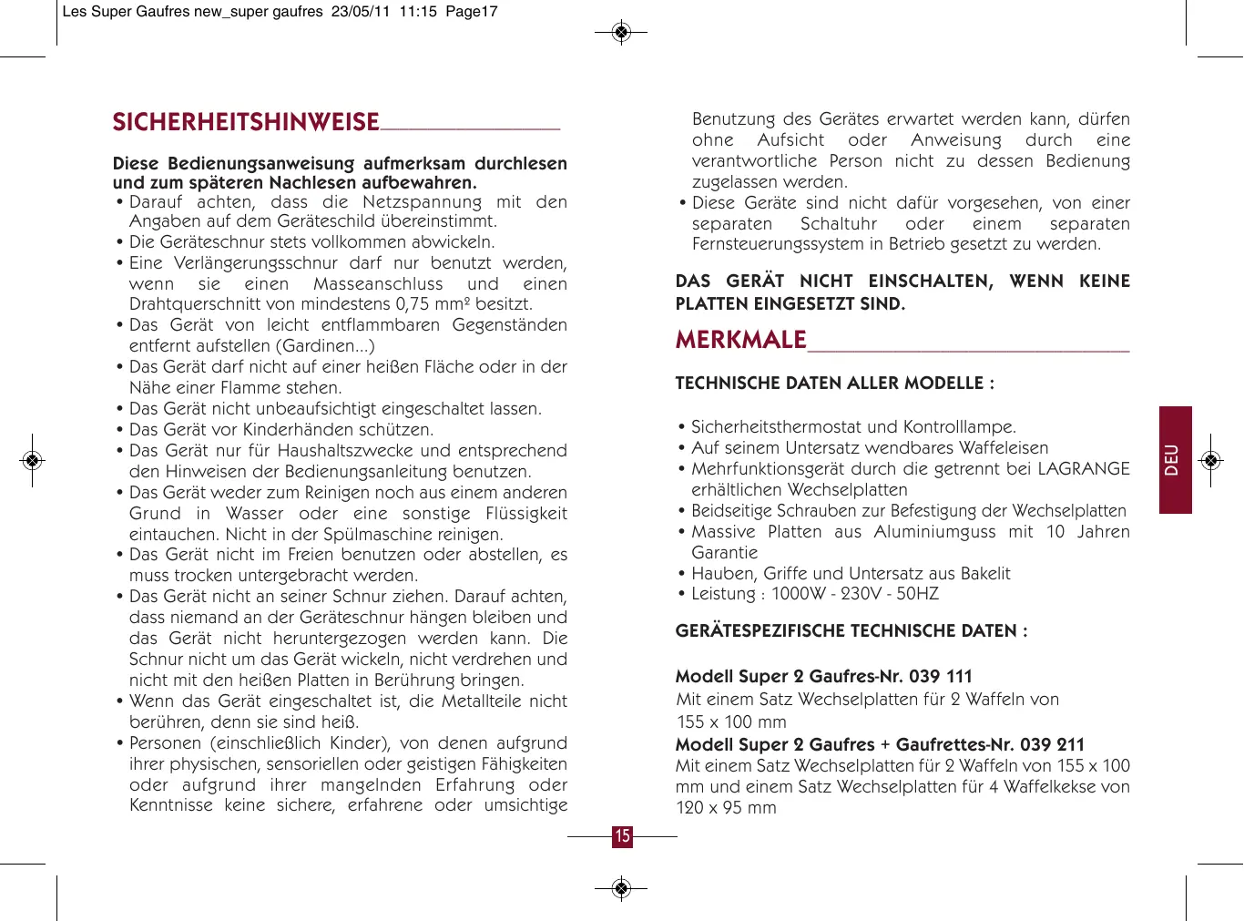 - Leistung : 1000W - 230V - 50HZ GERÄTESPEZIFISCHE TECHNISCHE DATEN : Modell Super 2 Gaufres-Nr. 039 111 Mit einem Satz Wechselplatten für 2 Waffeln von 155 x 100 mm Modell Super 2 Gaufres + Gaufrettes-Nr. 039 211 Mit einem Satz Wechselplatten für 2 Waffeln von 155 x 100 mm und einem Satz Wechselplatten für 4 Waffelkekse von 120 x 95 mm