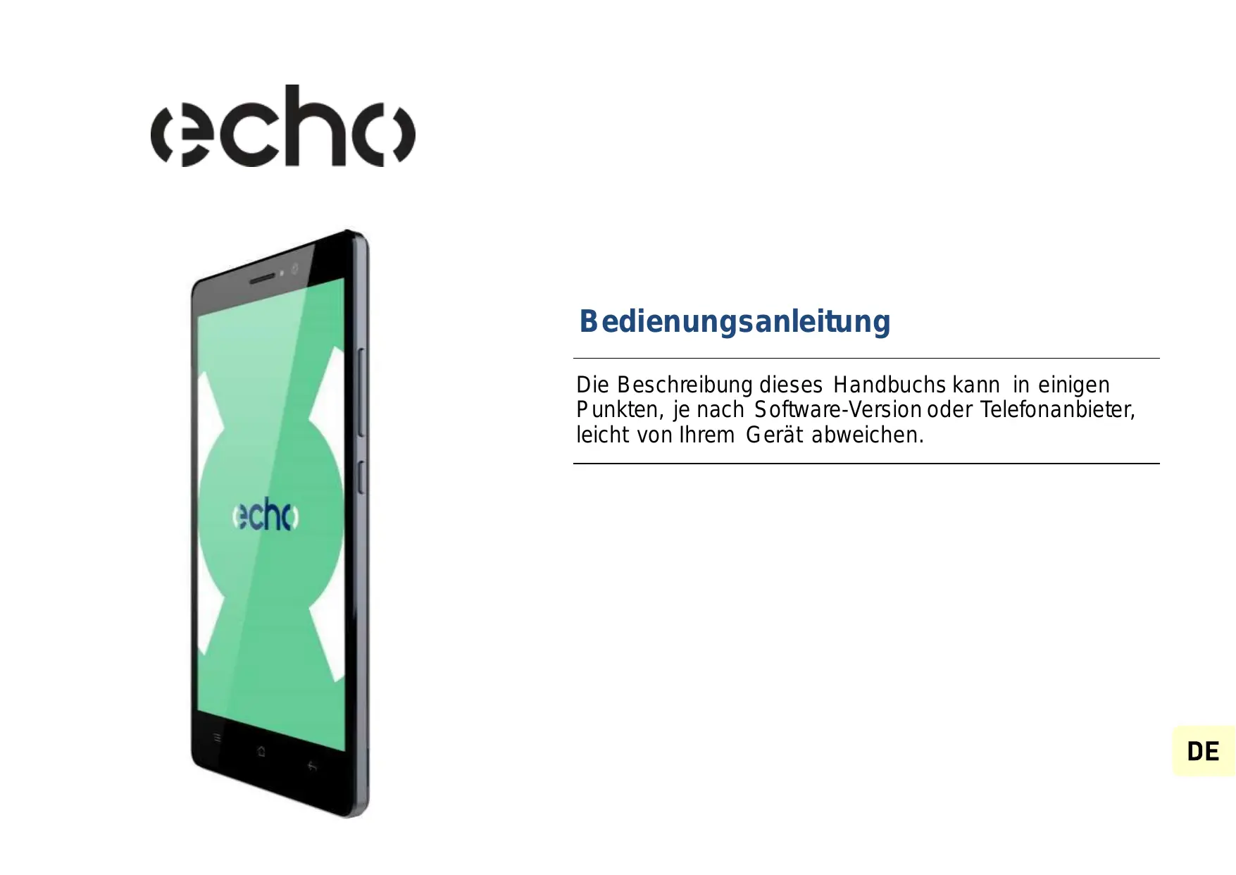 El texto íntegro de la Declaración de Conformidad del aparato puede obtenerse en https://www.echomobiles.com/assistance La escucha prolongada a fuerte potencia a través de cascos o auriculares puede provocar daños en la audición Bedienungsanleitung Die Beschreibung dieses Handbuchs kann in einigen Punkten, je nach Software-Version oder Telefonanbieter, leicht von Ihrem Gerät abweichen. HERZLICHEN GLÜCKWUNSCH ! Herzlichen Glückwunsch zum Kauf Ihres Mobiltelefons Echo Max In dieser Anleitung finden Sie alle notwendigen Informationen zur Benutzung des Mobiltelefons, um sich möglichst schnell mit dem ECHO-Umfeld vertraut machen zu können. Copyright©2015 ECHO Die in diesem Handbuch enthaltenen Informationen dürfen unter keinen Umständen in irgendeiner Form weiterverbreitet oder reproduziert werden, es sei denn mit ausdrücklicher Genehmigung von ECHO. Handelsmarken ECHO ist eine eingetragene Marke der Modelabs Mobiles SAS. Hinweis Dieses Handbuch wurde mit größter Sorgfalt erstellt und hat zum Ziel, Sie bei der Benutzung dieses Geräts anzuleiten. Die hierin enthaltenen Informationen und Empfehlungen unterliegen nach anwendbarem Recht keiner Garantie. ECHO behält sich das Recht vor, die in diesem Handbuch aufgeführten Informationen zu verändern. Haftungsbeschränkung Alle über dieses Gerät verfügbaren Dienstleistungen und Inhalte sind ausschließliches Eigentum Dritter und folglich gesetzlich geschützt (Urheberrechte, Patente, Lizenzen und andere gesetzliche Regelungen zum Schutz geistigen Eigentums). Diese Dienstleis- tungen sind auf Ihre persönliche Nutzung beschränkt und dürfen nicht für gewerbliche Zwecke verwendet werden. Es ist nicht möglich, diese Dienstleistungen oder Inhalte ohne eine vorherige schriftliche Anfrage beim Eigentümer des Inhalts zu benutzen. Sie haben keinesfalls das Recht, die durch dieses Gerät zur Verfügung gestellten Dienstleistungen oder Inhalte auf irgendeine Weise und mithilfe irgendeines Mediums zu kopieren, zu veröffentlichen, zu übertragen, zu verkaufen oder geschäftlich zu nutzen oder von ihnen abgeleitete Versionen zu erstellen. DIE DIENSTLEISTUNGEN ODER INHALTE DRITTER WERDEN IHREM ORIGINALZUSTAND ZUR VERFÜGUNG