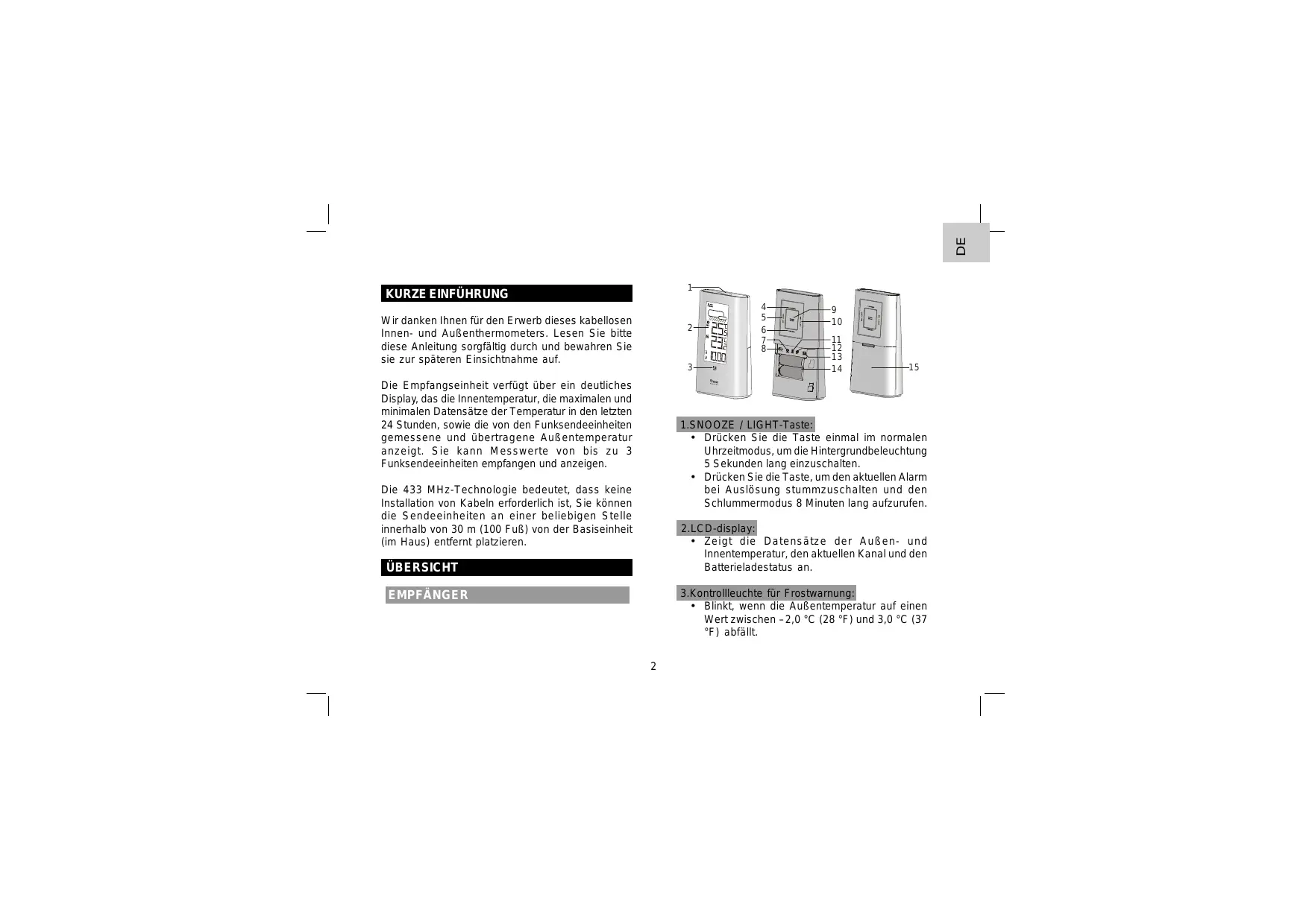 - Zeigt die Datensätze der Außen- und Innentemperatur, den aktuellen Kanal und den Batterieladestatus an. ÜBERSICHT 3.Kontrollleuchte für Frostwarnung: