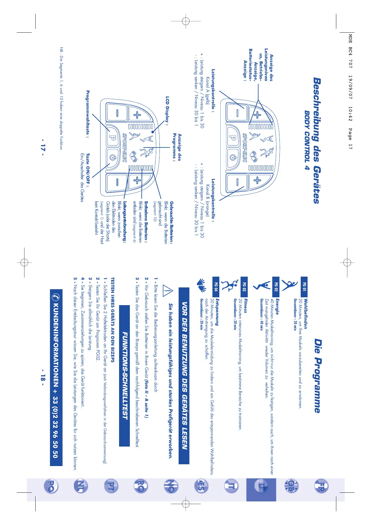 MDE BC4 707 19/09/07 10:42 Page 19 ALLGEMEINES DER BATTERIEN SPORT-ELEC Body Control 4 wurde für Frauen und Männer mit Körperbewusstsein entwickelt. SPORT-ELEC Body Control 4, ist ein Gerät für passives Training durch Elektro-Muskelstimulation. Die Muskeln, die Sie gestalten möchten, werden durch abwechselnde Kontraktur- und Ruhephasen trainiert. Das Ziel des SPORT-ELEC Body Control 4 ist das folgende: durch allgemeine Aktivierung der Muskulatur (Taille, Bauch, Po, Beine) und gezielte Entwicklung einzelner Muskeln (Arme, Brust, Bauch) die Silhouette zu verfeinern). SPORT-ELEC Body Control 4 nthält 4 Programme, die das Ergebnis der Forschungsarbeiten von SPORT-ELEC sind. Bei allen Programmen entsprechen die Frequenzen und Impulsbereiten den Bedürfnissen eines jeden Benutzers :