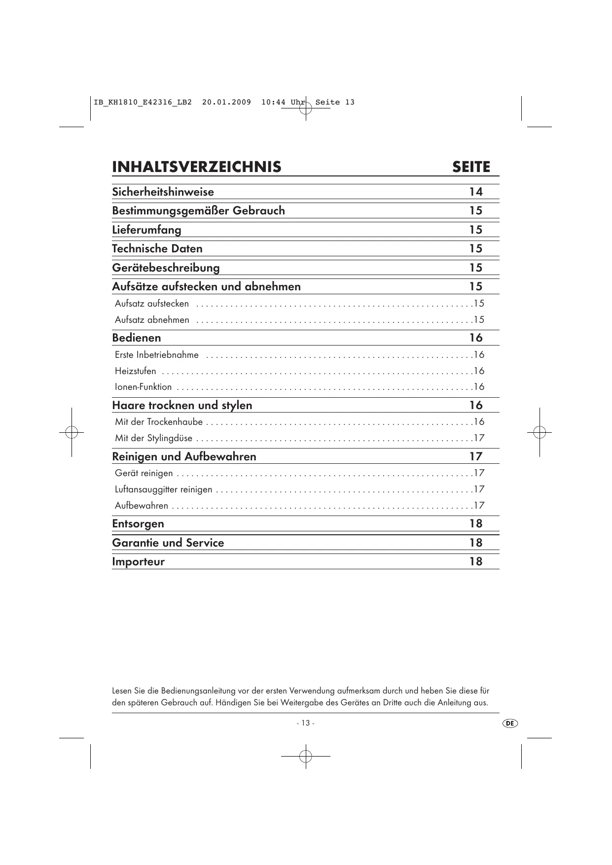 10:44 Uhr INHALTSVERZEICHNIS Seite 13 SEITE Sicherheitshinweise