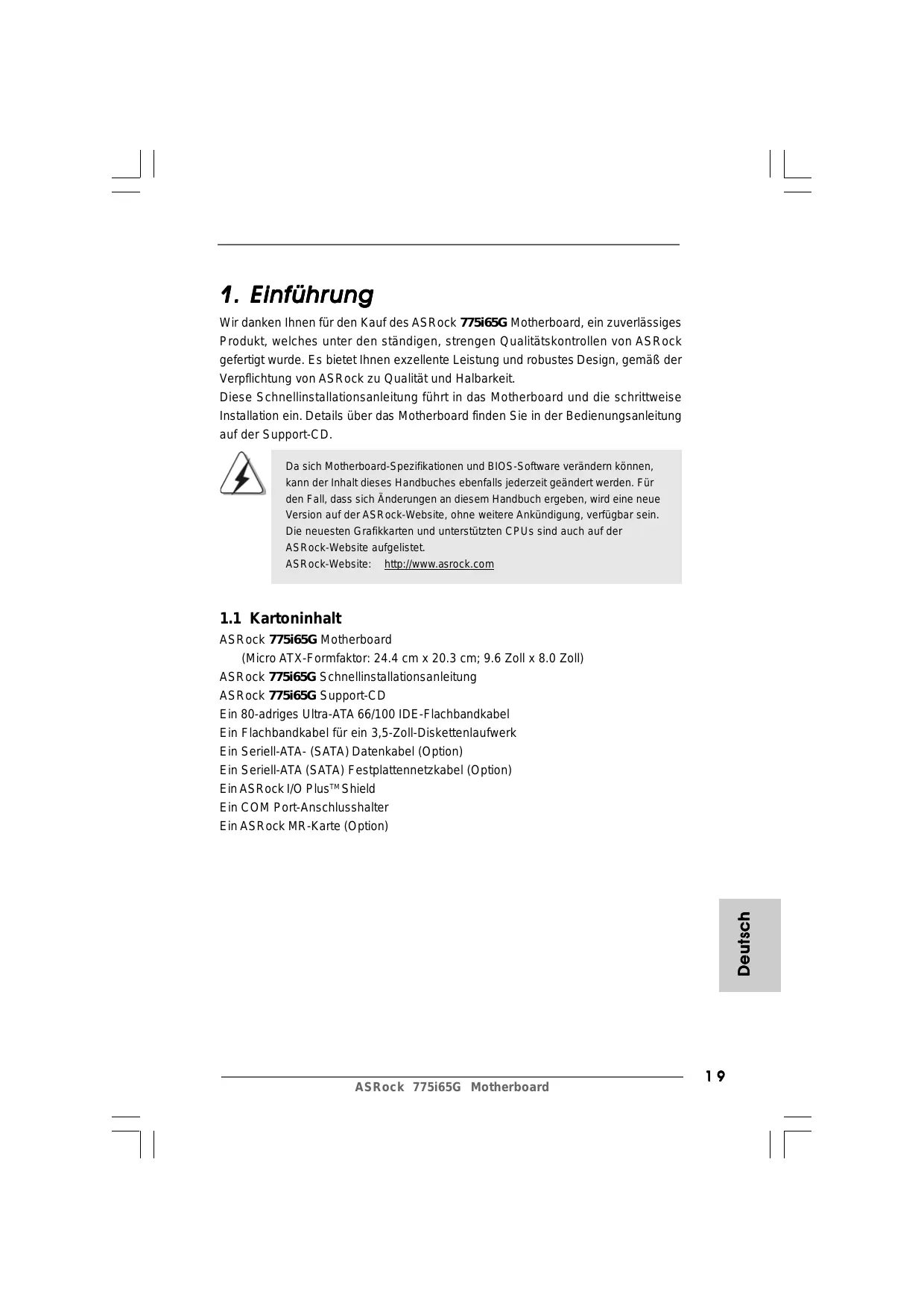 ASRock 77565G Motherboard {Micro ATX-Formfaktor: 24.4 cm x 20.3 cm; 9.6 Zoll x 8.0 Zoll) ASRock 775i65G Schnellinstallationsanleitung ASRock 775i65G Support-CD Ein 80-adriges Ultra-ATA 66/100 IDE-Flachbandkabel Ein Flachbandkabel für ein 3,5-Zoll-Diskettenlaufwerk Ein Seriell-ATA- (SATA) Datenkabel (Option) Ein Seriell-ATA (SATA) Festplattennetzkabel (Option) Ein ASRock 1/0 PlusT" Shield Ein COM Port-Anschlusshalter Ein ASRock MR-Karte (Option) ASRock 775i65G Motherboard Deutsch