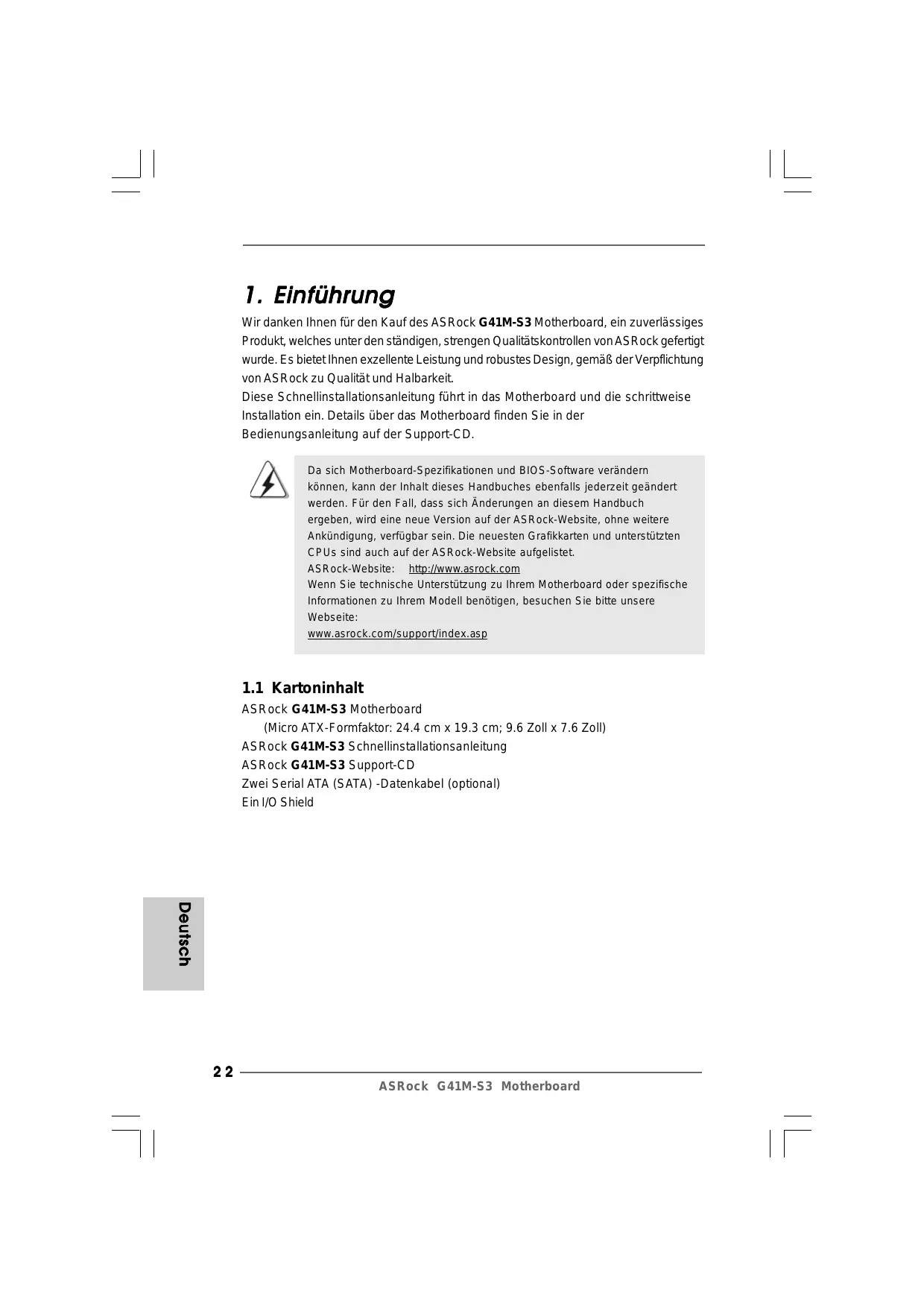 Wir danken Ihnen für den Kauf des ASRock G41M-S3 Motherboard, ein zuverlässiges Produkt, welches unter den ständigen, strengen Qualitätskontrollen von ASRock gefertigt wurde. Es bietet Ihnen exzellente Leistung und robustes Design, gemäß der Verpflichtung von ASRock zu Qualität und Halbarkeit. Diese Schnellinstallationsanleitung führt in das Motherboard und die schrittweise Installation ein. Details über das Motherboard finden Sie in der Bedienungsanleitung auf der Support-CD. Da sich Motherboard-Spezifikationen und BIOS-Software verändern können, kann der Inhalt dieses Handbuches ebenfalls jederzeit geändert werden. Für den Fall, dass sich Änderungen an diesem Handbuch ergeben, wird eine neue Version auf der ASRock-Website, ohne weitere Ankündigung, verfügbar sein. Die neuesten Grafikkarten und unterstützten CPUs sind auch auf der ASRock-Website aufgelistet. ASRock-Website: http://www.asrock.com Wenn Sie technische Unterstützung zu Ihrem Motherboard oder spezifische Informationen zu Ihrem Modell benötigen, besuchen Sie bitte unsere Webseite: www.asrock.com/support/index.asp