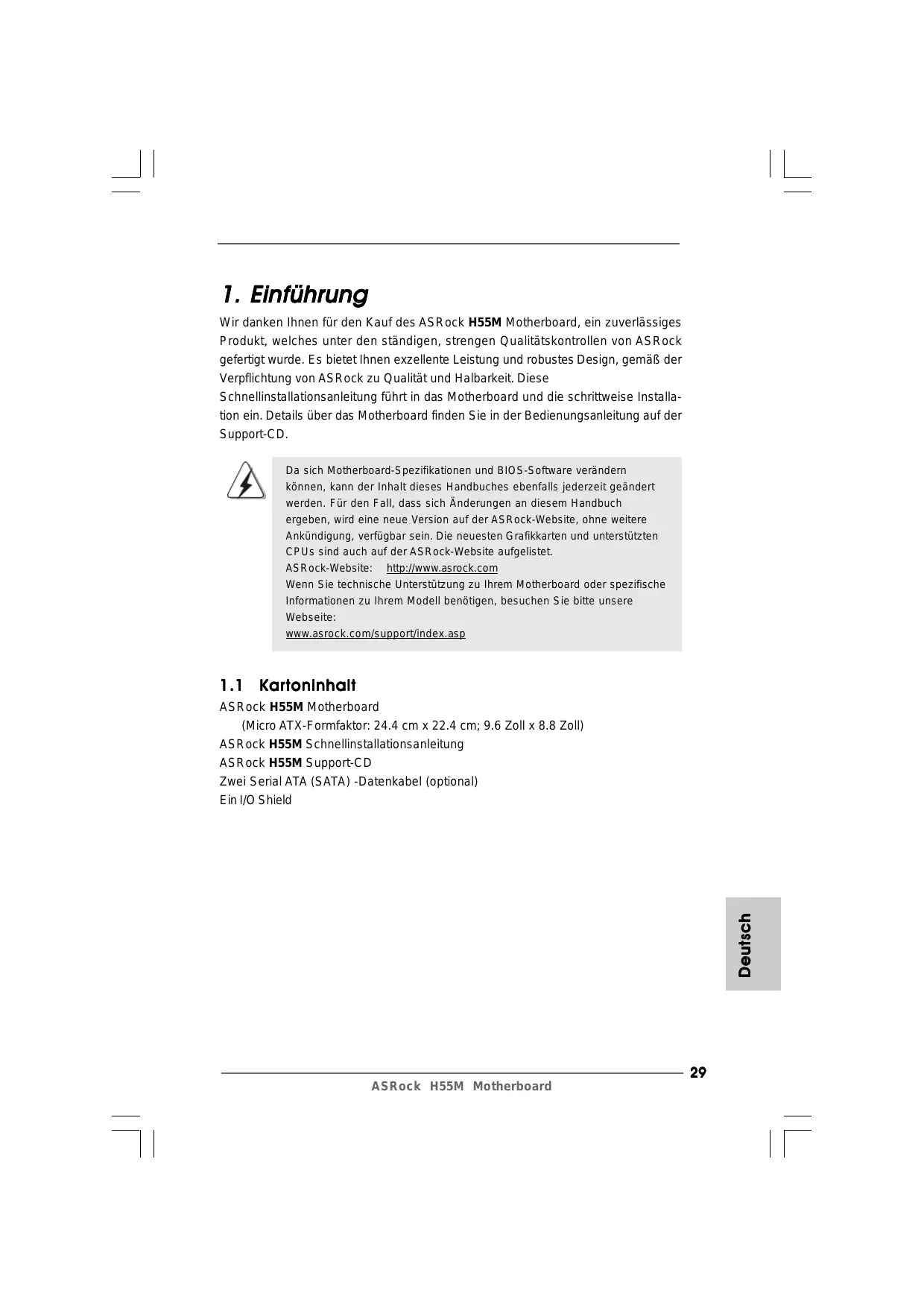 Wir danken Ihnen für den Kauf des ASRock H55M Motherboard, ein zuverlüssiges Produkt, welche unter den ständigen, strengen Qualitätskontrollen von ASRock gefertigt wurde. Es bietet Ihnen exzellente Leistung und robustes Design, gemäß der Verpflichtung von ASRock zu Qualität und Halbarkeit. Diese