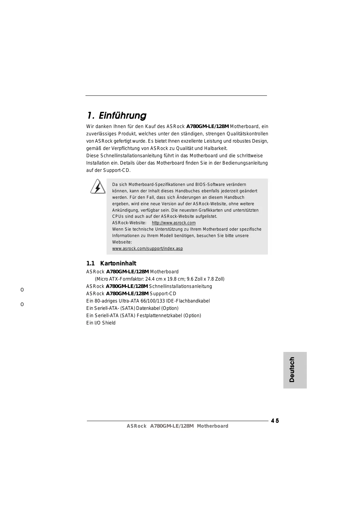 Wir danken Ihnen für den Kauf des ASRock A780GM-LE/128M Motherboard, ein zuverlässiges Produkt, welches unter den ständigen, strengen Qualitätskontrollen von ASRock gefertigt wurde. Es bietet Ihnen exzellente Leistung und robustes Design, gemäß der Verpflichtung von ASRock zu Qualität und Halbarkeit. Diese Schnellinstallationsanleitung führt in das Motherboard und die schrittweise Installation ein. Details über das Motherboard finden Sie in der Bedienungsanleitung auf der Support-CD. Da sich Motherboard-Spezifikationen und BIOS-Software verändern können, kann der Inhalt dieses Handbuches ebenfalls jederzeit geändert werden. Für den Fall, dass sich Änderungen an diesem Handbuch ergeben, wird eine neue Version auf der ASRock-Website, ohne weitere Ankündigung, verfügbar sein. Die neuesten Grafikkarten und unterstützten CPUs sind auch auf der ASRock-Website aufgelistet. ASRock-Website: http://www.asrock.com Wenn Sie technische Unterstützung zu Ihrem Motherboard oder spezifische Informationen zu Ihrem Modell benötigen, besuchen Sie bitte unsere Webseite: www.asrock.com/support/index.asp