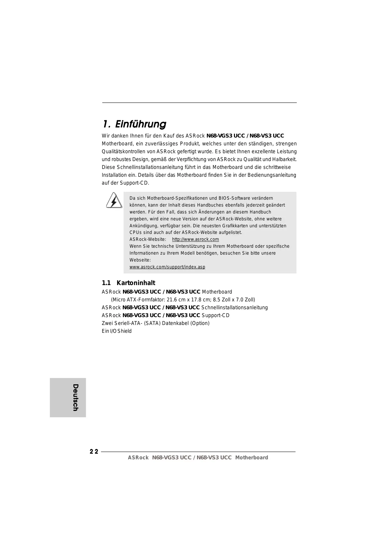Wir danken Ihnen für den Kauf des ASRock N68-VGS3 UCC / N68-VS3 UCC Motherboard, ein zuverlässiges Produkt, welches unter den ständigen, strengen Qualitätskontrollen von ASRock gefertigt wurde. Es bietet Ihnen exzellente Leistung und robustes Design, gemäß der Verpflichtung von ASRock zu Qualität und Halbarkeit. Diese Schnellinstallationsanleitung führt in das Motherboard und die schrittweise Installation ein. Details über das Motherboard finden Sie in der Bedienungsanleitung auf der Support-CD. Da sich Motherboard-Spezifikationen und BIOS-Software verändern können, kann der Inhalt dieses Handbuches ebenfalls jederzeit geändert werden. Für den Fall, dass sich Änderungen an diesem Handbuch ergeben, wird eine neue Version auf der ASRock-Website, ohne weitere Ankündigung, verfügbar sein. Die neuesten Grafikkarten und unterstützten CPUs sind auch auf der ASRock-Website aufgelistet. ASRock-Website: http://www.asrock.com Wenn Sie technische Unterstützung zu Ihrem Motherboard oder spezifische Informationen zu Ihrem Modell benötigen, besuchen Sie bitte unsere Webseite: www.asrock.com/support/index.asp