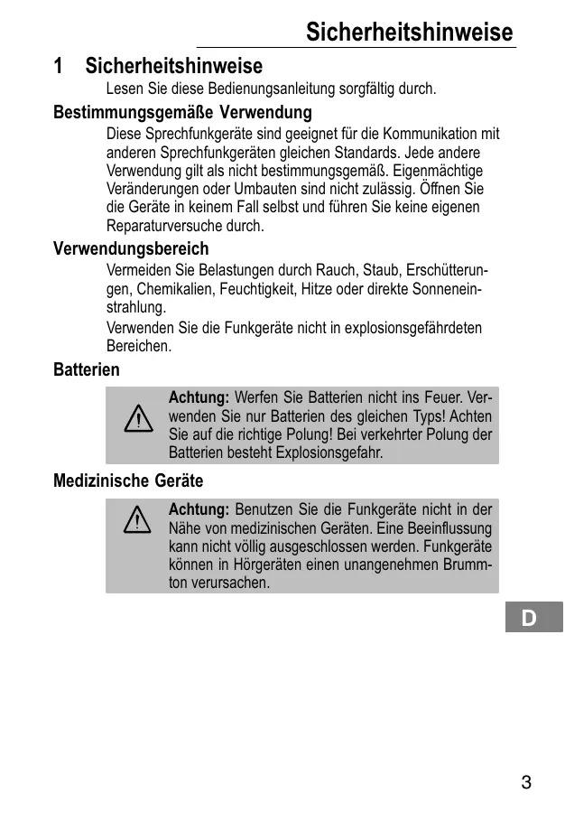 Achtung: Benutzten Sie die Funkgeräte nicht in der Nähe von medizinischen Geräten. Eine Beeinflussung kann nicht vollig ausgeschlossen werden. Funkgeräte konnen in Hörgeräten einen unangenehmen Brummton verursachen.