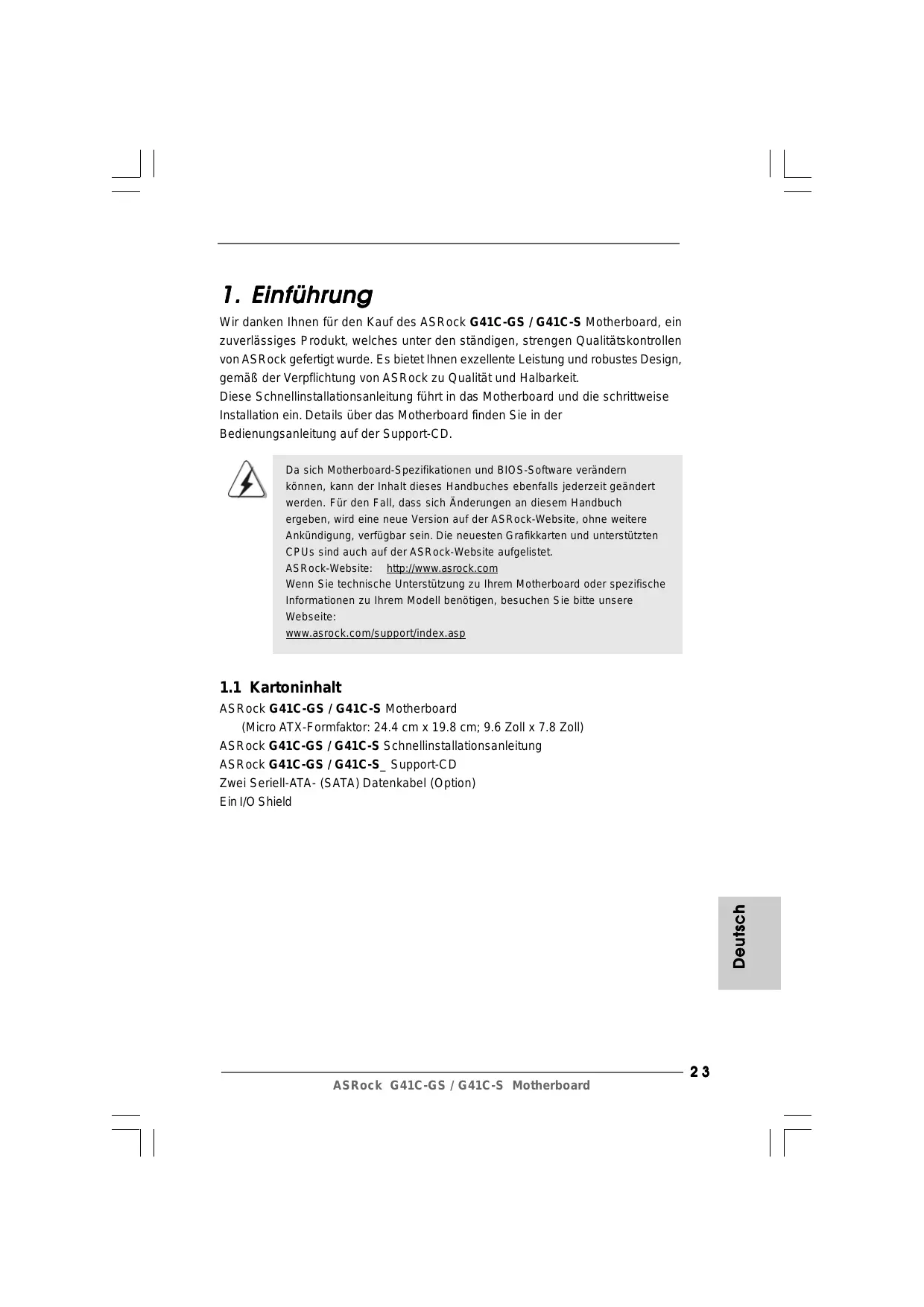 Wir danken Ihnen für den Kauf des ASRock G41C-GS / G41C-S Motherboard, ein zuverlässiges Produkt, welches unter den ständigen, strengen Qualitätskontrollen von ASRock gefertigt wurde. Es bietet Ihnen exzellente Leistung und robustes Design, gemäß der Verpflichtung von ASRock zu Qualität und Halbarkeit. Diese Schnellinstallationsanleitung führt in das Motherboard und die schrittweise Installation ein. Details über das Motherboard finden Sie in der Bedienungsanleitung auf der Support-CD. Da sich Motherboard-Spezifikationen und BIOS-Software verändern können, kann der Inhalt dieses Handbuches ebenfalls jederzeit geändert werden. Für den Fall, dass sich Änderungen an diesem Handbuch ergeben, wird eine neue Version auf der ASRock-Website, ohne weitere Ankündigung, verfügbar sein. Die neuesten Grafikkarten und unterstützten CPUs sind auch auf der ASRock-Website aufgelistet. ASRock-Website: http://www.asrock.com Wenn Sie technische Unterstützung zu Ihrem Motherboard oder spezifische Informationen zu Ihrem Modell benötigen, besuchen Sie bitte unsere Webseite: www.asrock.com/support/index.asp