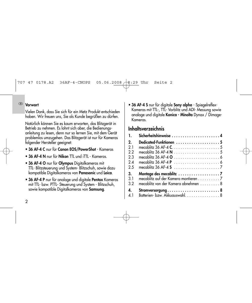 707 47 0178.A2 36AF-4-CNOPS ® Vorwort Vielen Dank, dass Sie sich für ein Metz Produkt entschieden haben. Wir freuen uns, Sie als Kunde begrüfBen zu dürfen. Naïürlich kônnen Sie es kaum erwarten, das Blitzgerät in Betrieb zu nehmen. Es lohnt sich aber, die Bedienungs- anleitung zu lesen, denn nur so lernen Sie, mit dem Gerët problen los umzugehen. Das Blitzgerät ist nur für Kameras folgender Hersteller geeignet: + 36 AF-4 C nur für Canon EOS/PowerShot - Kameras + 36 AF-4 N nur für Nikon TTL und iTTL - Kameras. + 36 AF-4 O nur Für Olympus Digitalkameras mit TTL: Blitzsteuerung und System- Blitzschuh, sowie dazu kompatible Digitalkameras von Panasonic und Leica: + 36 AF-4 P nur für analoge und digitale Pentax Kameras mit TTL- bzw. PTIL- Steuerung und System - Blitzschuh, sowie kompatible Digitalkameras von Samsung