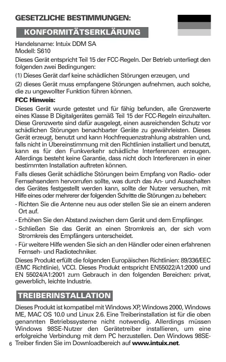 Dieses Produkt ist kompatibel mit Windows XP,Windows 2000,Windows ME, MAC OS 10.0 und Linux 2.6. Eine Treiberinstallation ist für die oben genannten Betriebssysteme nicht notwendig. Allerdings müssen Windows 98SE-Nutzer den Gerätetreiber installieren, um eine erfolgliche Verbindung mit dem PC herzustellen. Den Windows 98SE- Treiber finden Sie im Downloadbereich auf www.intuix.net