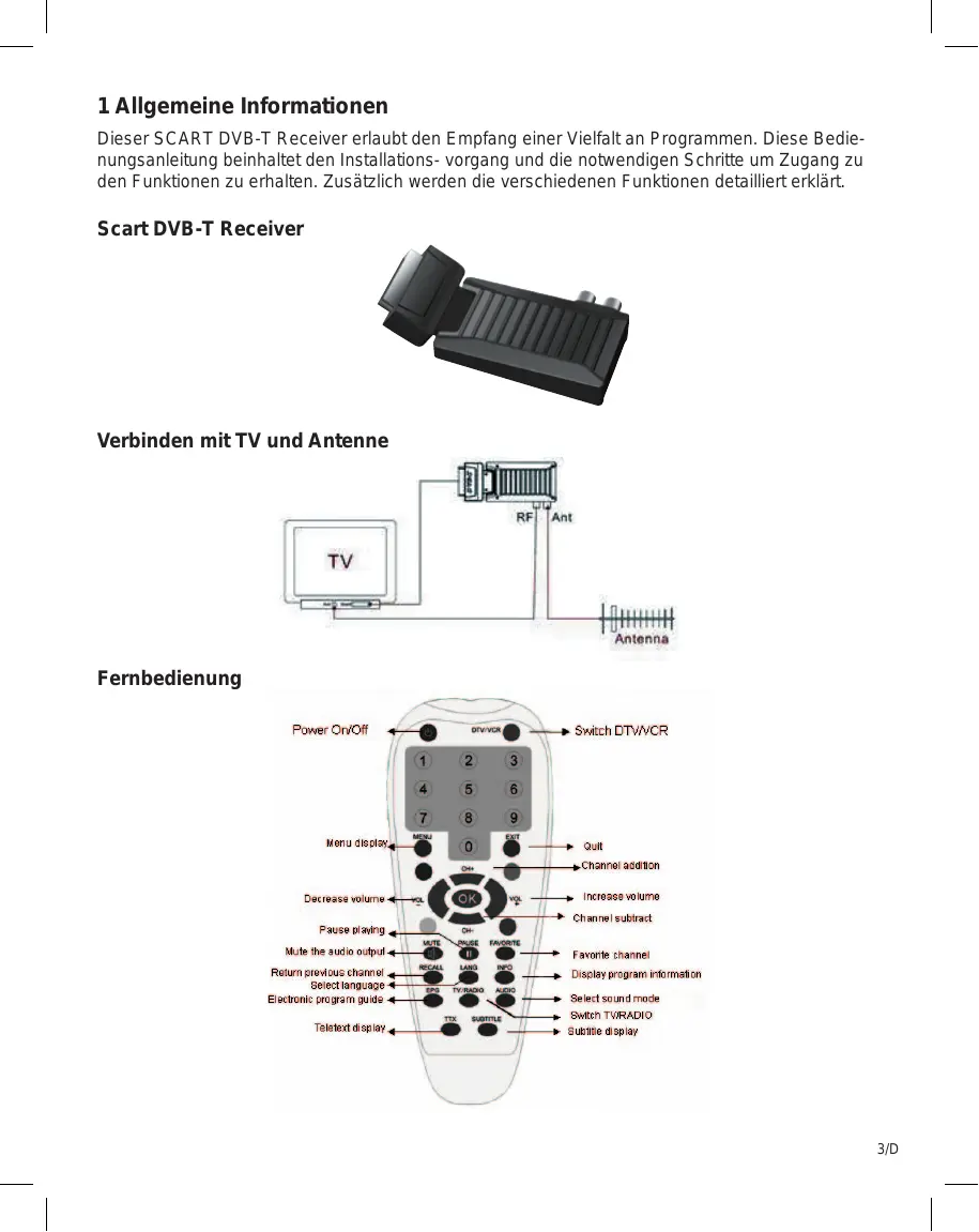 Dieser SCART DVB-T Receiver erlaubt den Empfang einer Vielfalt an Programmen. Diese Bedienungsanleitung beinhaltet den Installations- vorgang und die notwendigen Schritte um Zugang zu den Funktionen zu erhalten. Zusätzlich werden die verschiedene Funktionen detailiert erklär.