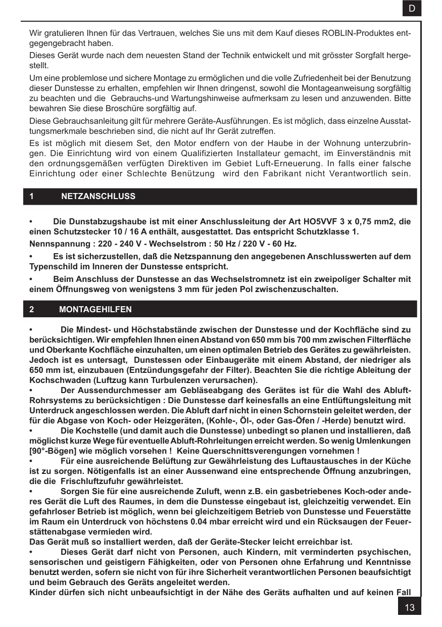 Wir gratulieren Ihnen für das Vertrauen, welches Sie uns mit dem Kauf dieses ROBLIN-Produktes entgegengebracht haben. Dieses Gerät wurde nach dem neuesten Stand der Technik entwickelt und mit grösster Sorgfalt hergestellt. Um eine problemlose und sichere Montage zu ermöglichen und die volle Zufriedenheit bei der Benutzung dieser Dunstesse zu erhalten, empfehlen wir Ihnen dringenst, sowohl die Montageanweisung sorgfältig zu beachten und die Gebrauchs-und Wartungshinweise aufmerksam zu lesen und anzuwenden. Bitte bewahren Sie diese Broschüre sorgfältig auf. Diese Gebrauchsanleitung gilt für mehrere Geräte-Ausführungen. Es ist möglich, dass einzelne Ausstattungsmerkmale beschrieben sind, die nicht auf Ihr Gerät zutreffen. Es ist möglich mit diesem Set, den Motor endfern von der Haube in der Wohnung unterzubringen. Die Einrichtung wird von einem Qualifizierten Installateur gemacht, im Einverständnis mit den ordnungsgemäßen verfügten Direktiven im Gebiet Luft-Erneuerung. In falls einer falsche Einrichtung oder einer Schlechte Benützung wird den Fabrikant nicht Verantwortlich sein.
