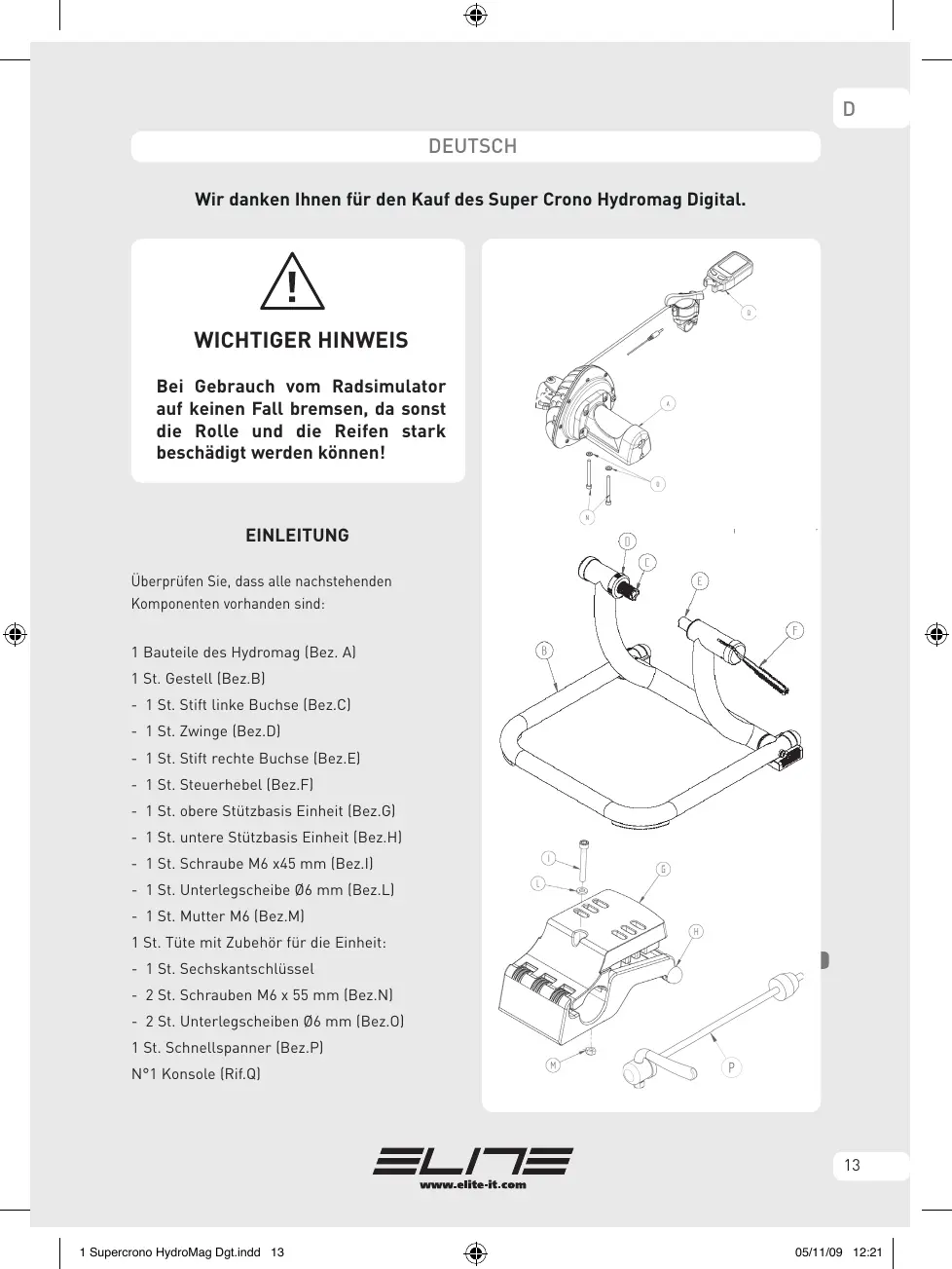 DEUTSCH Wir danken Ihnen für den Kauf des Super Crono Hydromag Digital. WICHTIGER HINWEIS Bei Gebrauch vom Radsimulator auf keinen Fall bremsen, da sonst die Rolle und die Reifen stark beschädigt werden können! EINLEITUNG Überprüfen Sie, dass alle nachstehenden Komponenten vorhanden sind: 1 Bauteile des Hydromag (Bez. A) 1 St. Gestell (Bez.B) - 1 St. Stift linke Buchse (Bez.C) - 1 St. Zwinge (Bez.D) - 1 St. Stift rechte Buchse (Bez.E) - 1 St. Steuerhebel (Bez.F) - 1 St. obere Stützbasis Einheit (Bez.G) - 1 St. untere Stützbasis Einheit (Bez.H) - 1 St. Schraube M6 x45 mm (Bez.I) - 1 St. Unterlegscheibe Ø6 mm (Bez.L) - 1 St. Mutter M6 (Bez.M) 1 St. Tüte mit Zubehör für die Einheit: - 1 St. Sechskantschlüssel