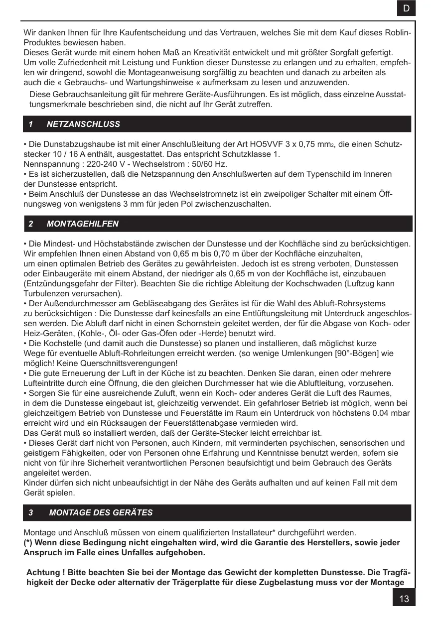 Montage und Anschluß müssen von einem qualifizierten Installateur* durchgeführt werden. (*) Wenn diese Bedingung nicht eingehalten wird, wird die Garantie des Herstellers, sowie jeder Anspruch im Falle eines Unfalles aufgehoben. Achtung ! Bitte beachten Sie bei der Montage das Gewicht der kompletten Dunstesse. Die Tragfähigkeit der Decke oder alternativ der Trägerplatte für diese Zugbelastung muss vor der Montage