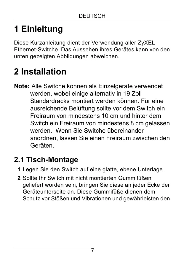Diese Kurzanleitung dient der Verwendung aller ZyXEL Ethernet-Switche. Das Aussehen ihres Gerätes kann von den unten gezeigten Abbildungen abweichen.