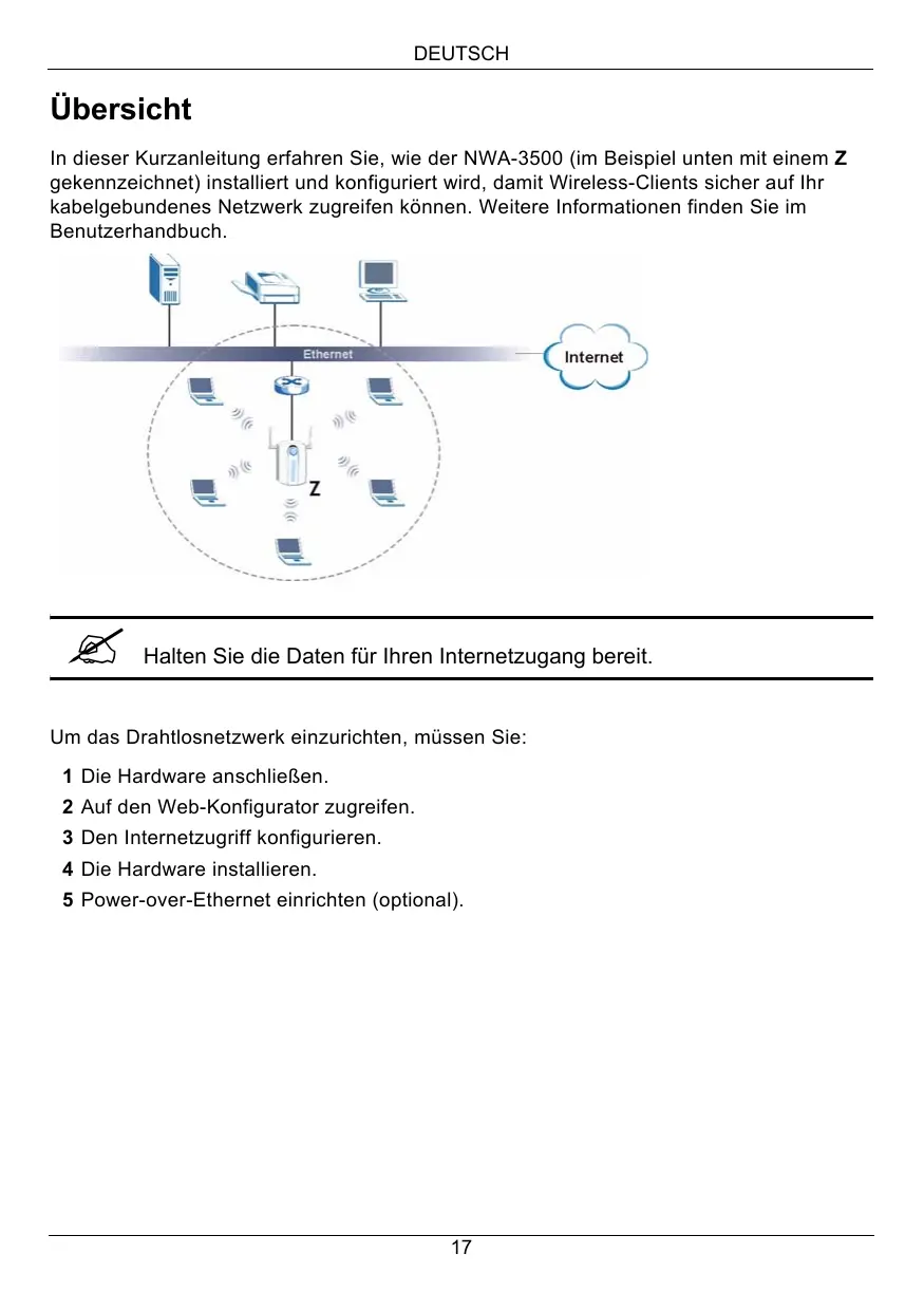 In dieser Kurzanleitung erfahren Sie, wie der NWA-3500 (im Beispiel unten mit einem Z gekennzeichnet) installiert und konfiguriert wird, damit Wireless-Clients sicher auf Ihr kabelgebundenes Netzwerk zugreifen kônnen. Weitere Informationen finden Sie im Benutzerhandbuch.