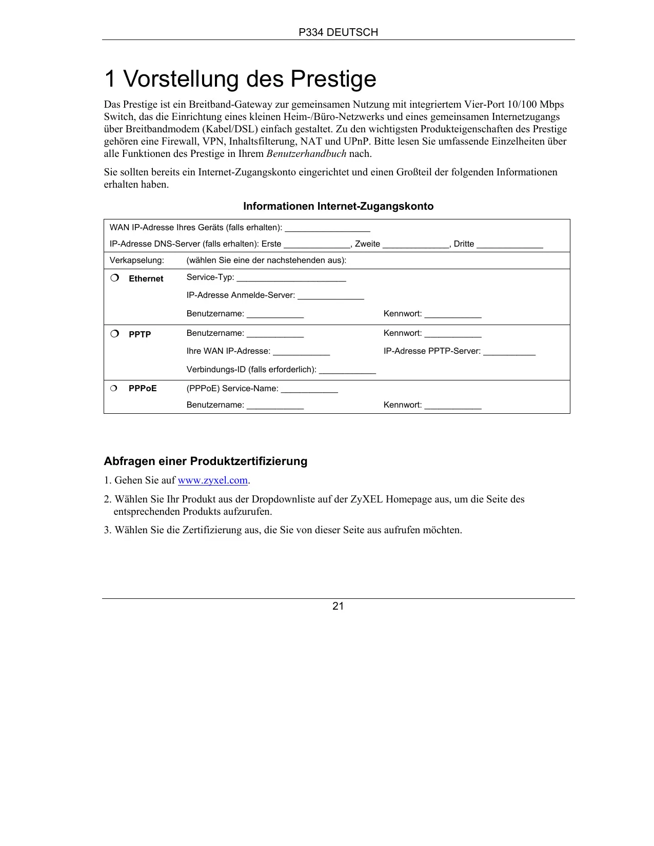 1 Vorstellung des Prestige Das Prestige ist ein Breitband-Gateway zur gemeinsamen Nutzung mit integriertem Vier-Port 10/100 Mbps Switch, das die Einrichtung eines kleinen Heim-/Büro-Netzwerks und eines gemeinsamen Internetzugangs über Breitbandmodem (Kabel/DSL) einfach gestaltet. Zu den wichtigsten Produkteigenschaften des Prestige gehören eine Firewall, VPN, Inhaltsfilterung, NAT und UPnP. Bitte lesen Sie umfassende Einzelheiten über alle Funktionen des Prestige in Ihrem Benutzerhandbuch nach. Sie sollten bereits ein Internet-Zugangskonto eingerichtet und einen Großteil der folgenden Informationen erhalten haben. Informationen Internet-Zugangskonto WAN IP-Adresse Ihres Geräts (falls erhalten): __________________ IP-Adresse DNS-Server (falls erhalten): Erste ______________, Zweite ______________, Dritte ______________ Verkapselung: