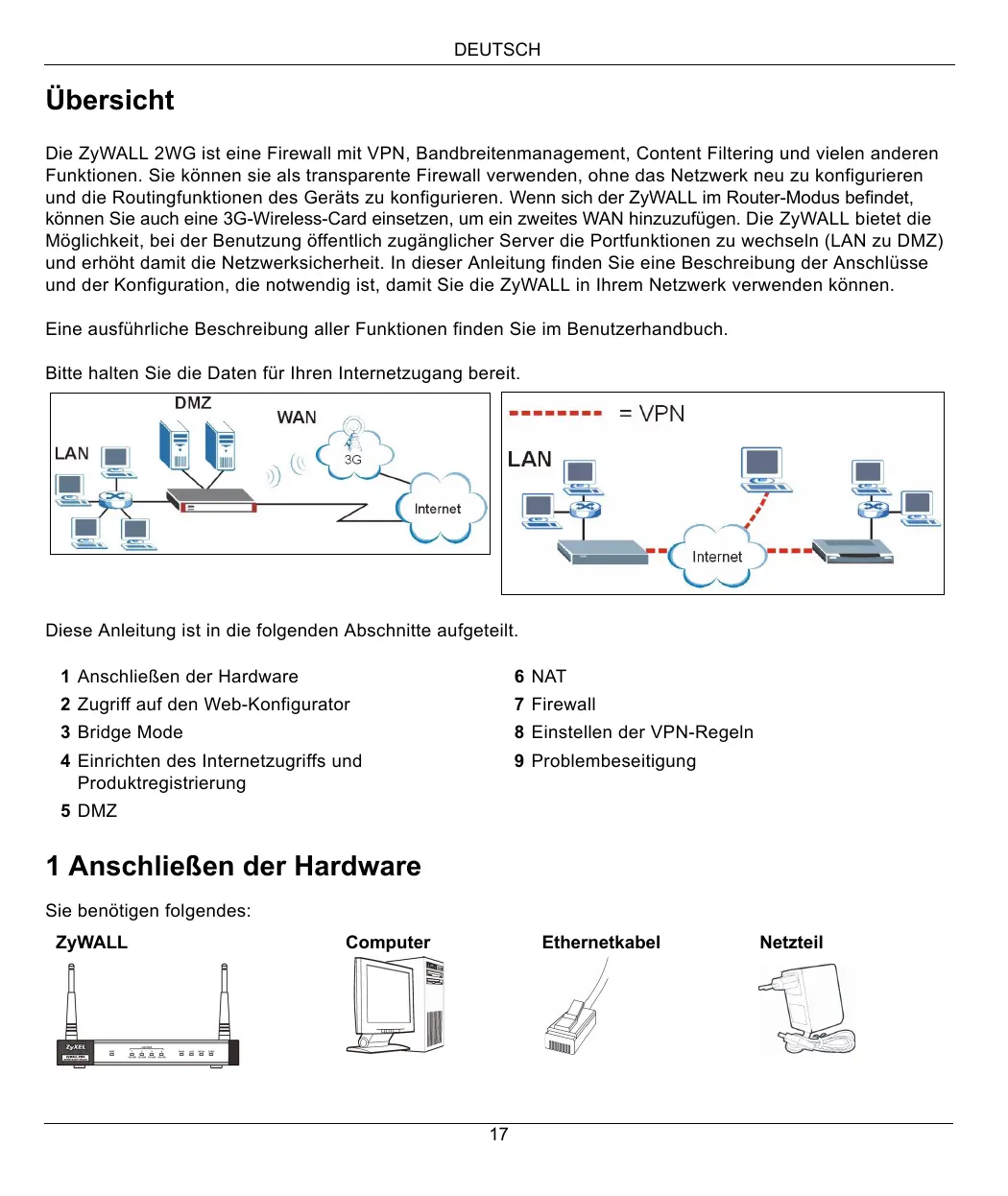 D Diese Anleitung ist in die folgenden Abschnitte aufgeteilt. 1 AnschlieRen der Hardware 6 NAT 2 Zugriff auf den Web-Konfigurator 7 Firewall 3 Bridge Mode 8 Einstellen der VPN-Regeln 4 Einrichten des Internetzugriffs und 9 Problembeseitigung Produktregistrierung 5 DMZ 1 AnschlieRen der Hardware Sie benôtigen folgendes: ZyWALL Computer Ethernetkabel Netzteil f = = ñ EL