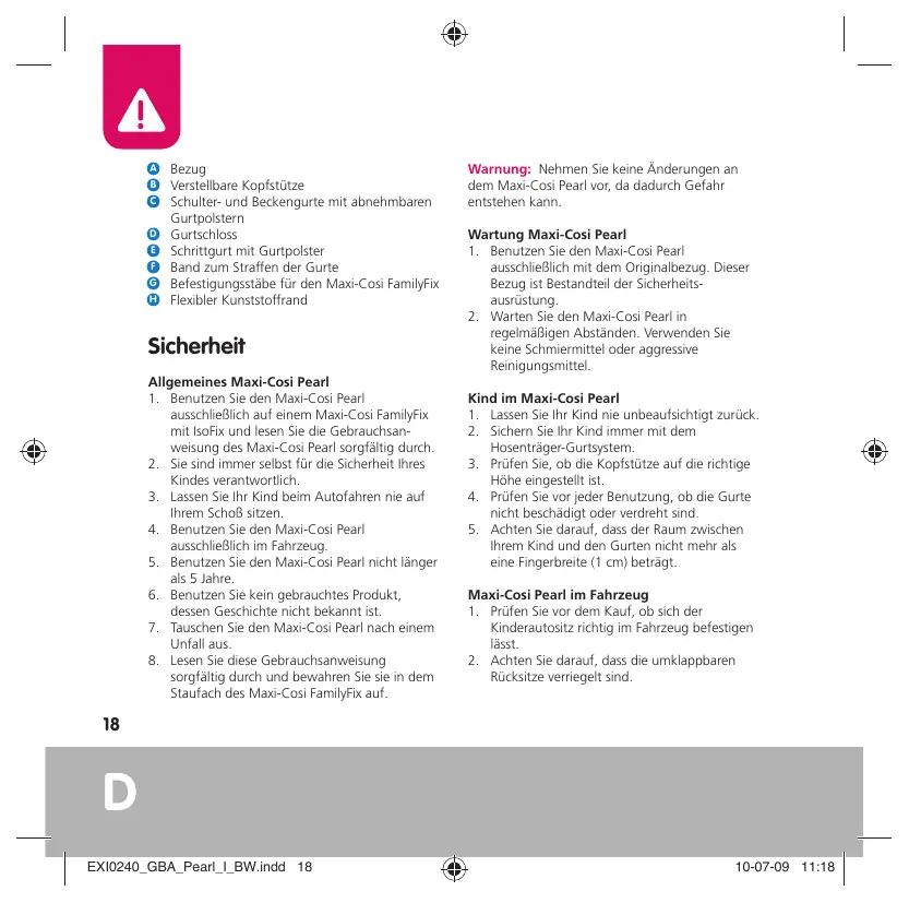 Sicherheit Allgemeines Maxi-Cosi Pearl 1. Benutzen Sie den Maxi-Cosi Pearl ausschließlich auf einem Maxi-Cosi FamilyFix mit IsoFix und lesen Sie die Gebrauchsanweisung des Maxi-Cosi Pearl sorgfältig durch. 2. Sie sind immer selbst für die Sicherheit Ihres Kindes verantwortlich. 3. Lassen Sie Ihr Kind beim Autofahren nie auf Ihrem Schoß sitzen. 4. Benutzen Sie den Maxi-Cosi Pearl ausschließlich im Fahrzeug. 5. Benutzen Sie den Maxi-Cosi Pearl nicht länger als 5 Jahre. 6. Benutzen Sie kein gebrauchtes Produkt, dessen Geschichte nicht bekannt ist. 7. Tauschen Sie den Maxi-Cosi Pearl nach einem Unfall aus. 8. Lesen Sie diese Gebrauchsanweisung sorgfältig durch und bewahren Sie sie in dem Staufach des Maxi-Cosi FamilyFix auf.