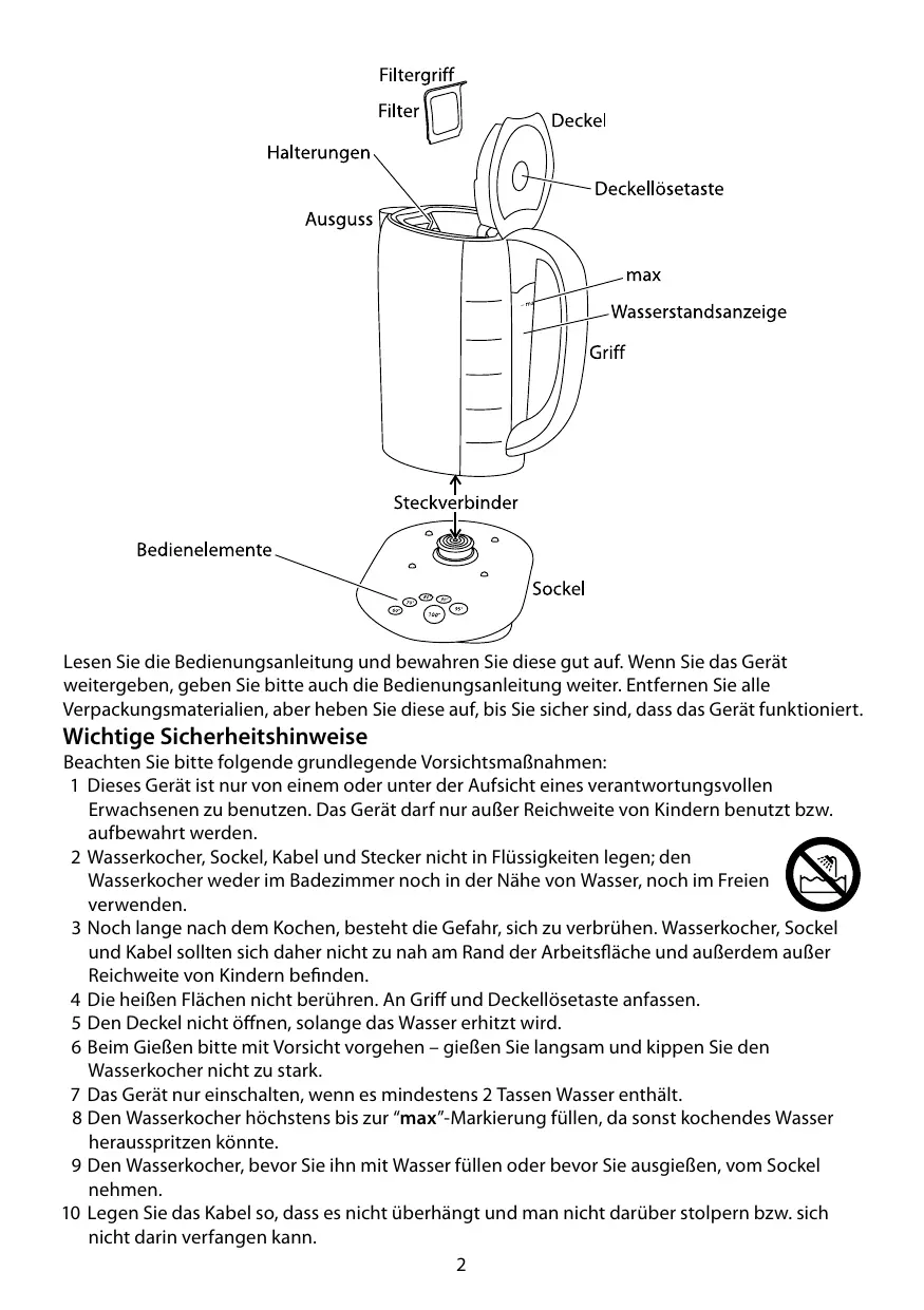 2 N'immergez pas la bouilloire, son socle, le câble ou la prise; n'utilisez pas la bouilloire dans une salle de bains, à proximité d'eau ou à l'extérieur. KR) 3 Le risque de brülure persiste longtemps après ébullition. Tenez la bouilloire, le socle W—S et le câble loin des bords des surfaces de travail et hors de portée des enfants. 4 Ne touchez pas les surfaces chaudes. Utilisez la poignée et le bouton de dégagement du couvercle. 5 Ne soulevez pas le couvercle pendant que l'eau chauffe. 6 Faites attention en versant - versez lentement, et n'inclinez pas trop la bouilloire 7 N'allumez pas si la bouilloire contient moins de deux tasses d'eau. 8 Ne remplissez pas au-delà de la marque maximum (max), car elle pourrait gicler de l'eau bouillante. 9 Enlevez la bouilloire de son socle avant de la remplir ou de verser. 10 Veillez à ce que le cordon d'alimentation ne soit pas en surplomb et qu'on ne puisse pas trébucher dessus ou l’accrocher. 11 Enroulez le surplus de câble sous le socle. 12 Débranchez le socle quand il n’est pas utilisé, avant de le bouger ou de le nettoyer. Laissez la bouilloire refroidir avant de la nettoyer et de la ranger. 13 Vérifiez que le couvercle est correctement fermé avant d'allumer la bouilloire, car sinon elle pourrait ne pas s'éteindre.